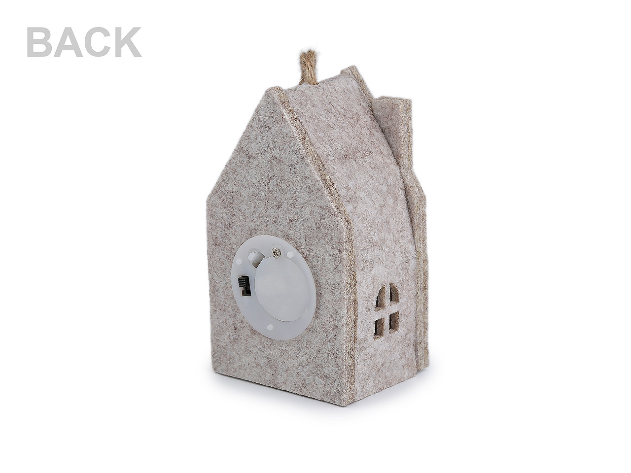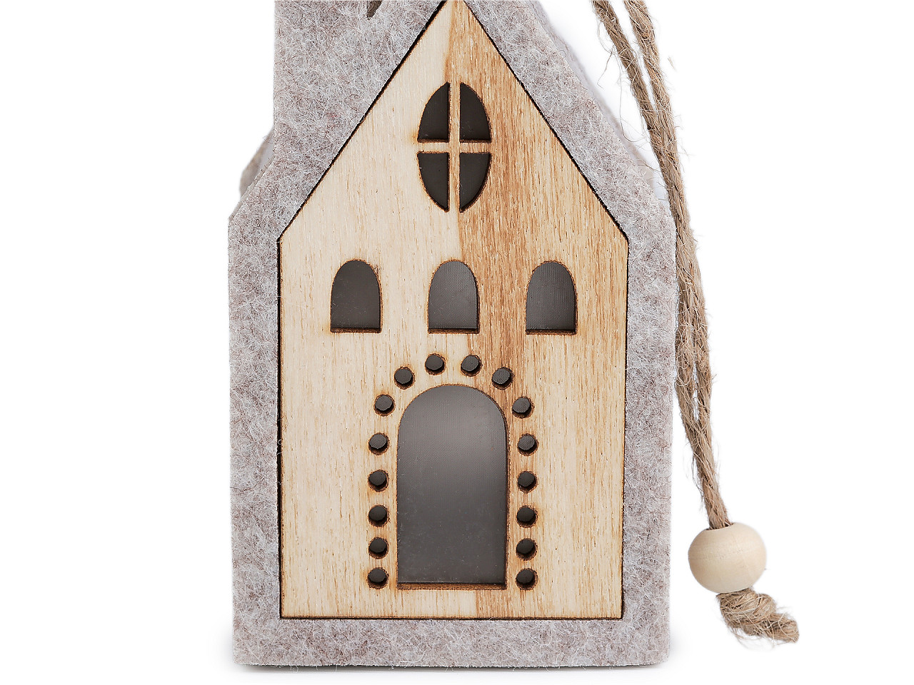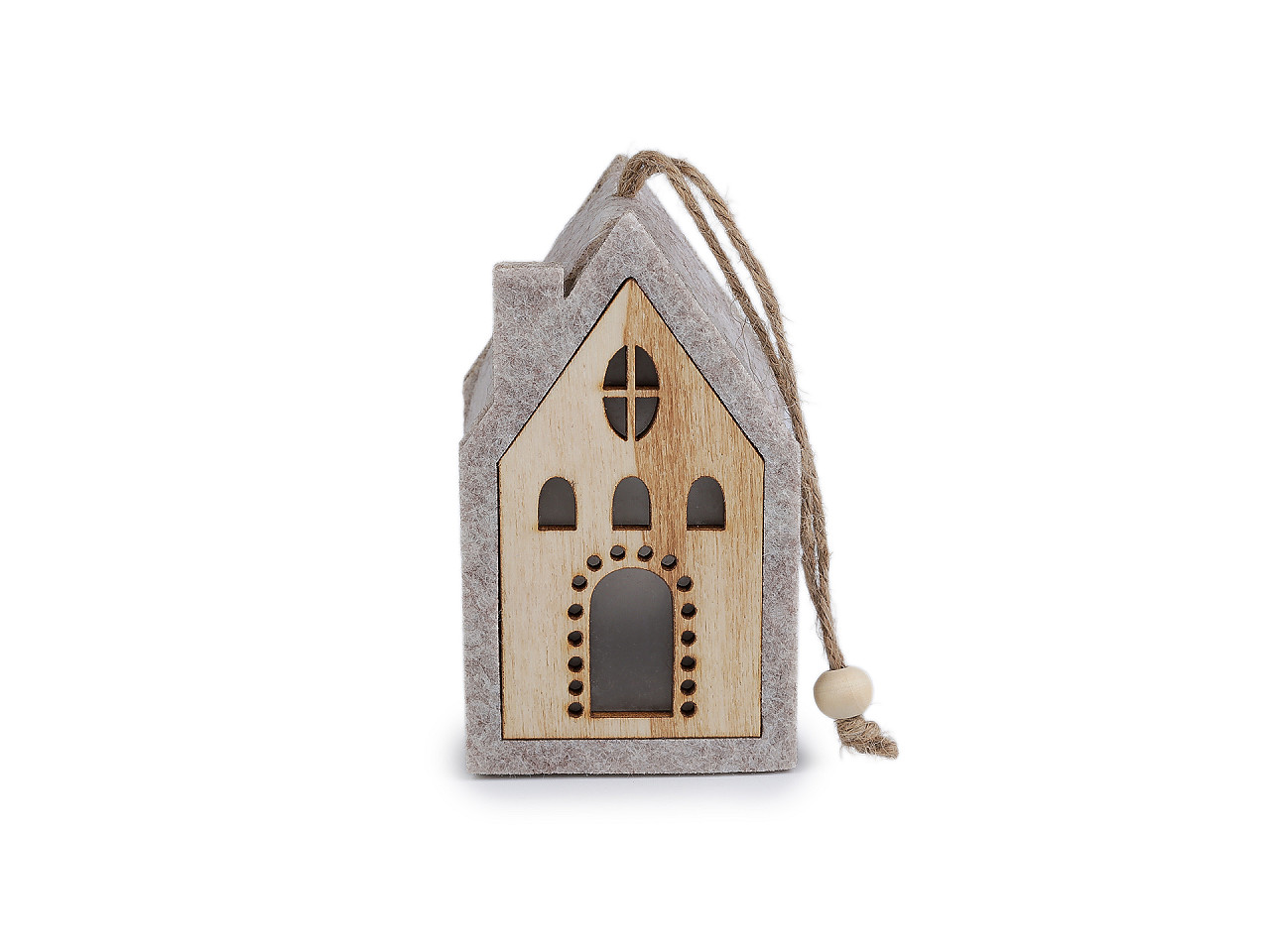 Svietiaci domček je vyrobený z kombinácie dreva a pevného filcu. Svieti príjemným teplým svetlom , ktoré vyzerá ako hviezdička. Vďaka pútku ho môžete zavesiť na vetvičky vo váze, na vence aj na vianočný stromček. Batéria (CR2032) je súčasťou balenia.