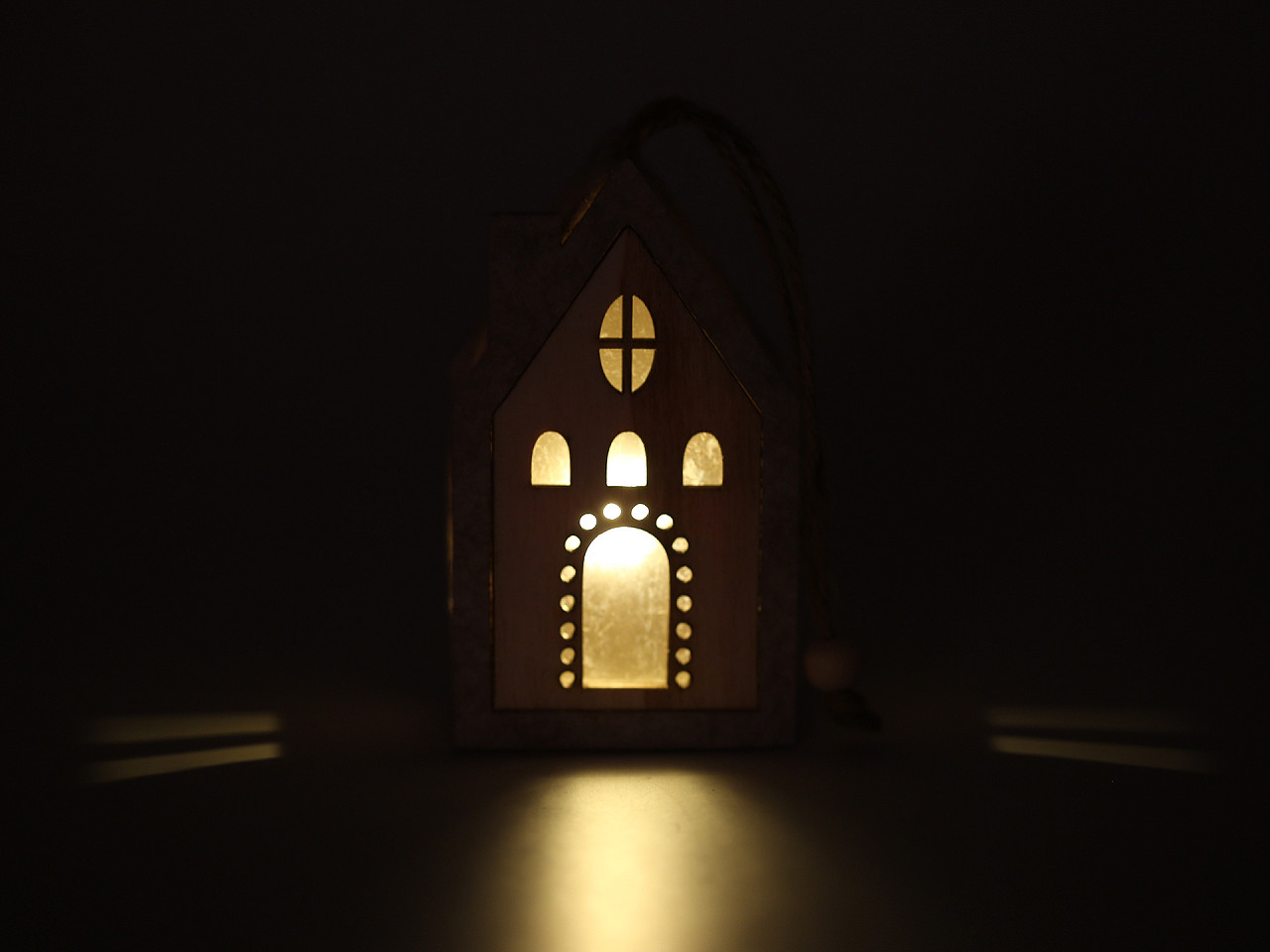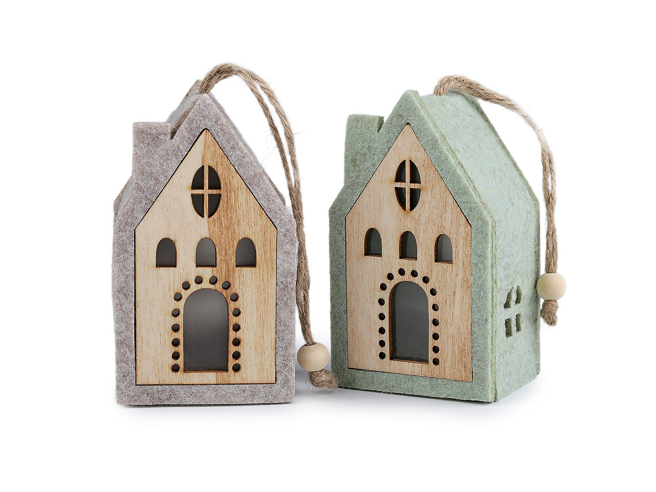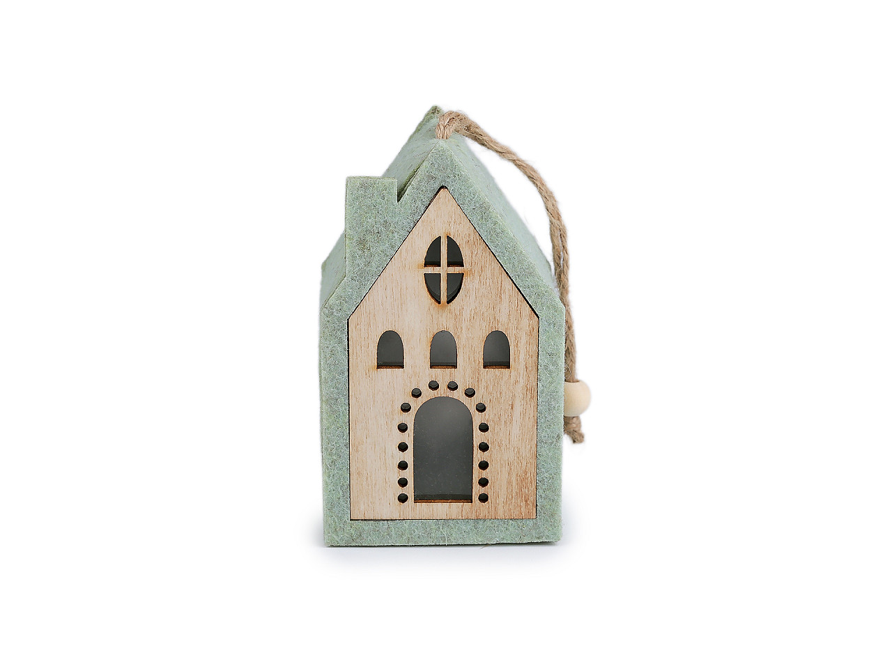 Svietiaci domček je vyrobený z kombinácie dreva a pevného filcu. Svieti príjemným teplým svetlom , ktoré vyzerá ako hviezdička. Vďaka pútku ho môžete zavesiť na vetvičky vo váze, na vence aj na vianočný stromček. Batéria (CR2032) je súčasťou balenia.