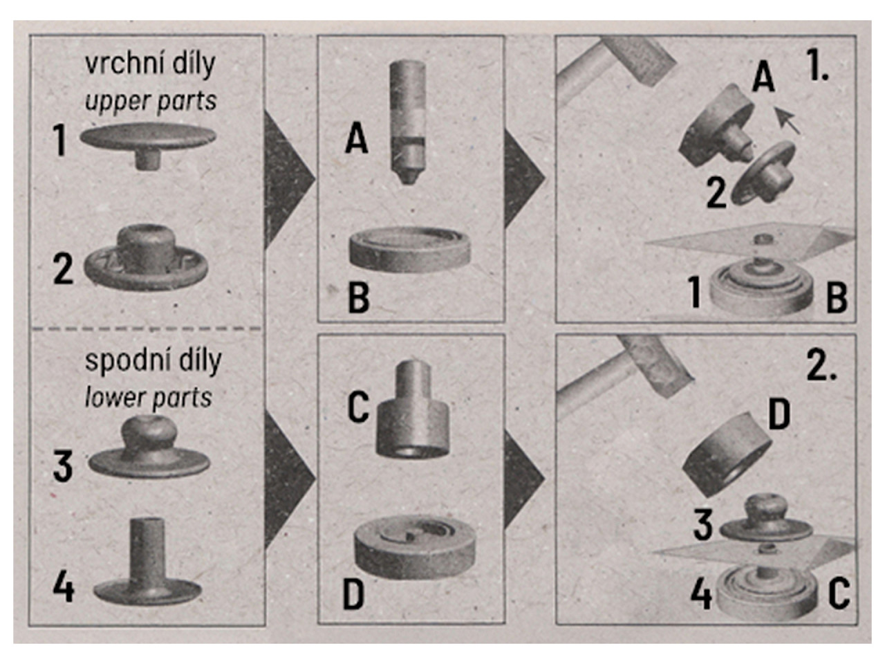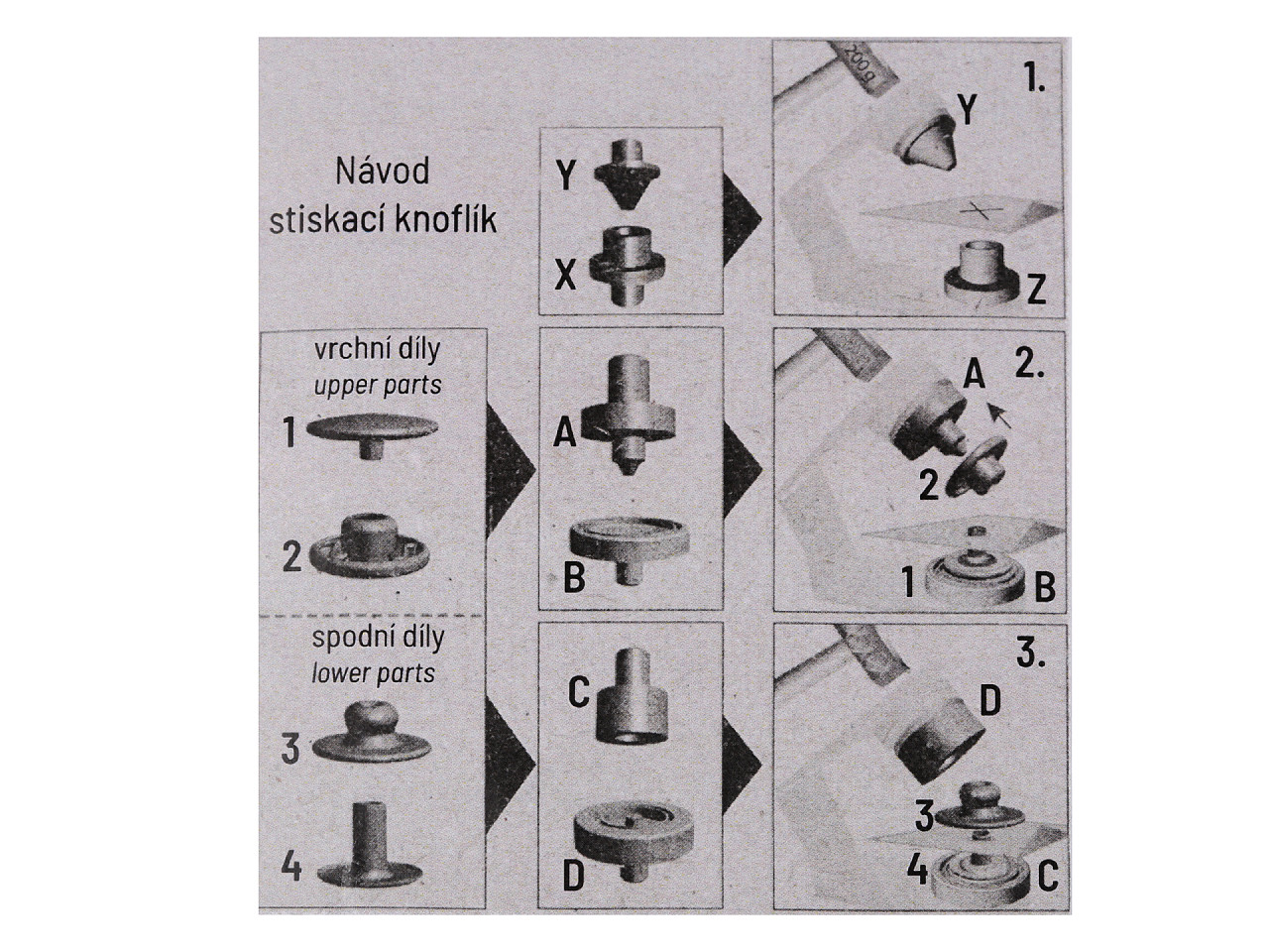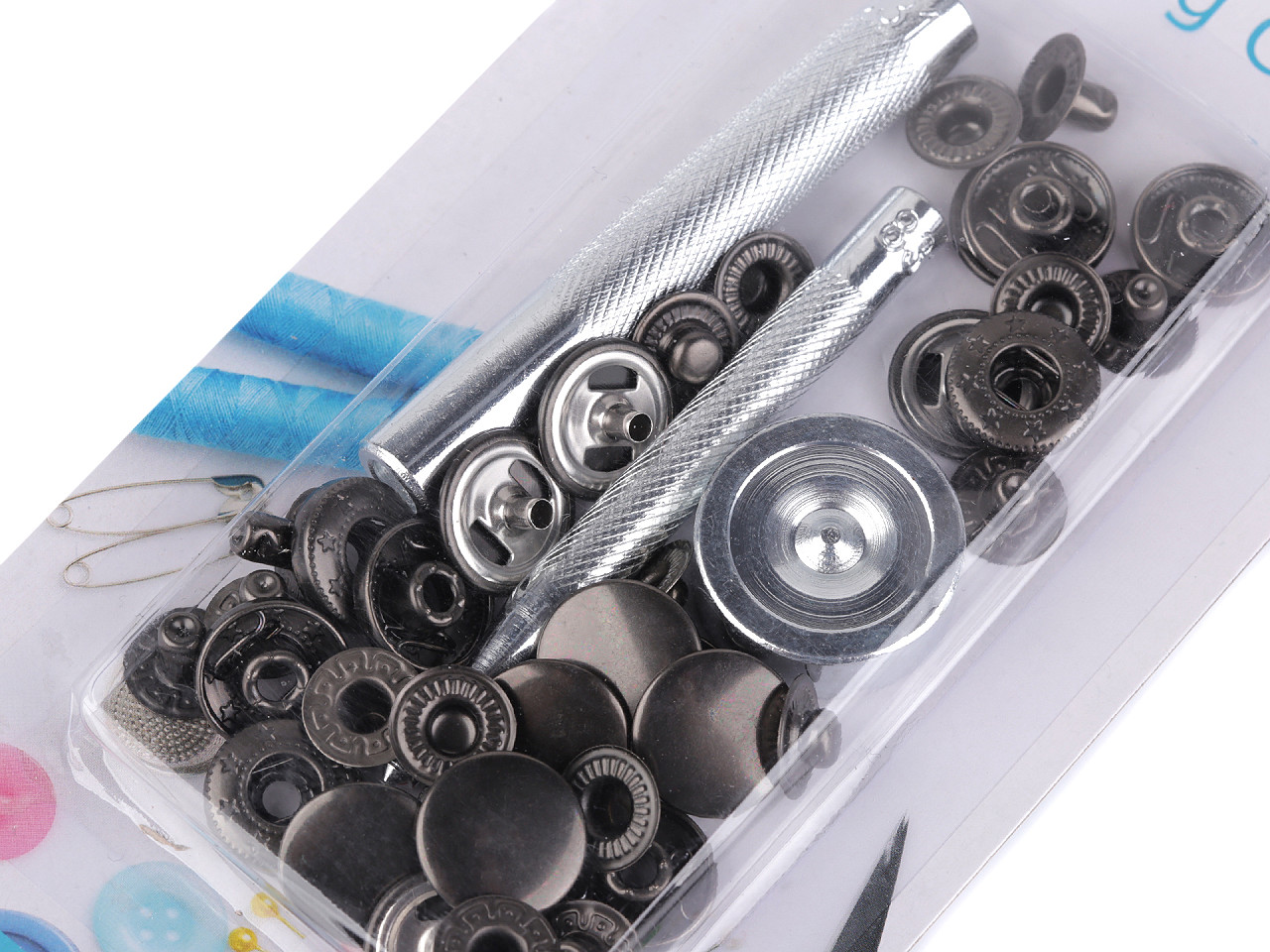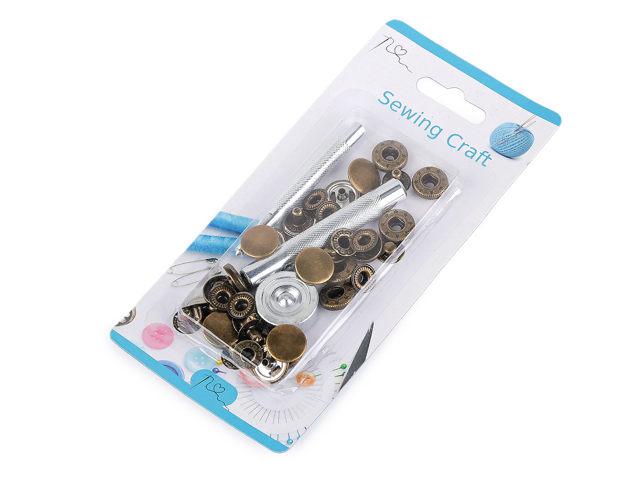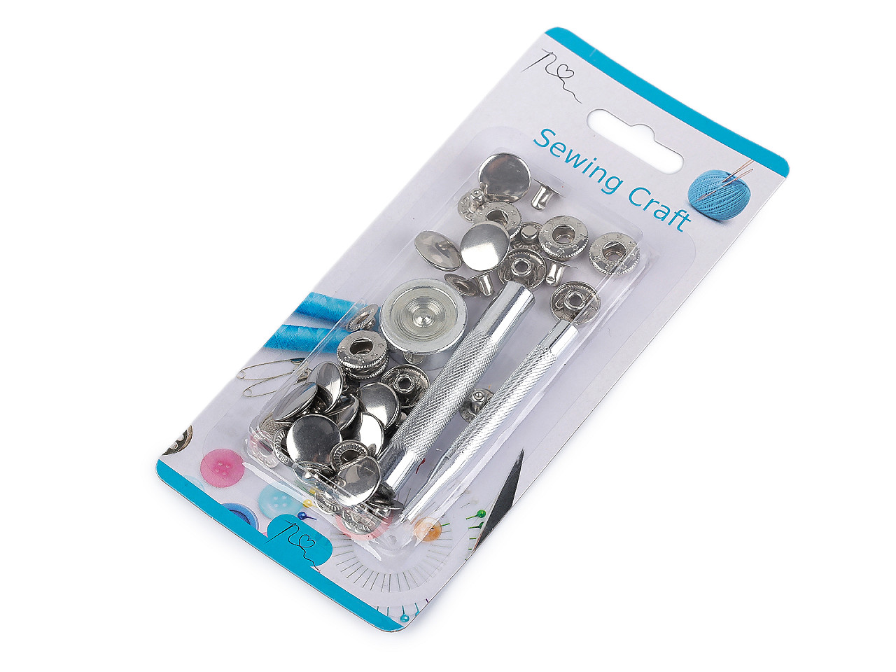 Kovové stláčacie gombíky využijete ako zapínanie na doplnky ako sú tašky, kabelky, batohy a pod. K aplikácii vám poslúži razič (dĺžka 7 cm), ktorý je súčasťou balenia. Gombíky sú vhodné na stredne hrubé materiály typu koženka, loneta a pod. Sada obsahuje 10 ks cvokov, raziče s nákovkou a návod na aplikáciu.