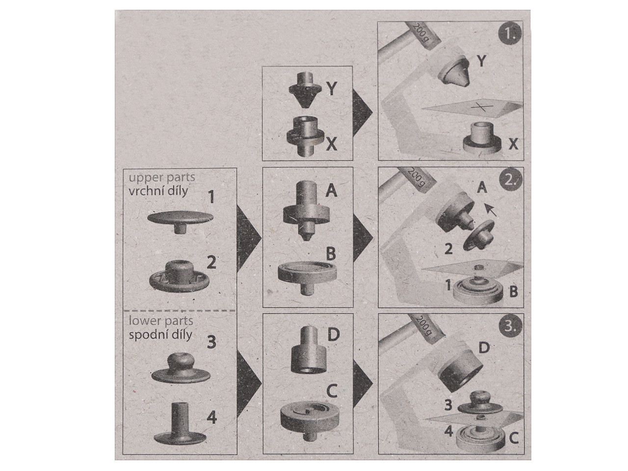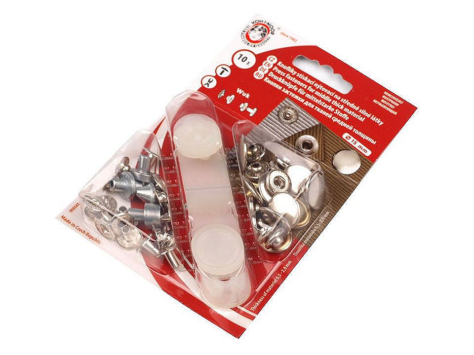 Stláčacie nehrdzavejúce gombíky sú určené na spájanie stredne hrubých látok s hrúbkou 0,5 - 1,5 mm . Nitovanie sa vykonáva plastovým mini lisom, ktorý je súčasťou balenia.