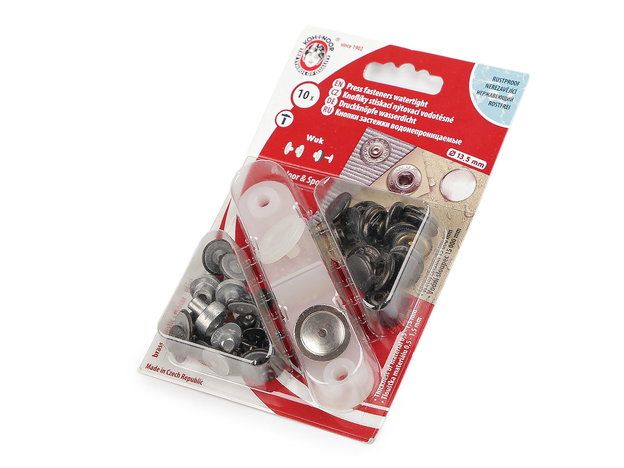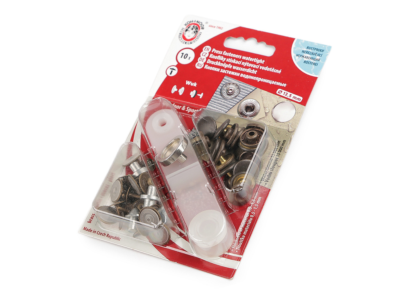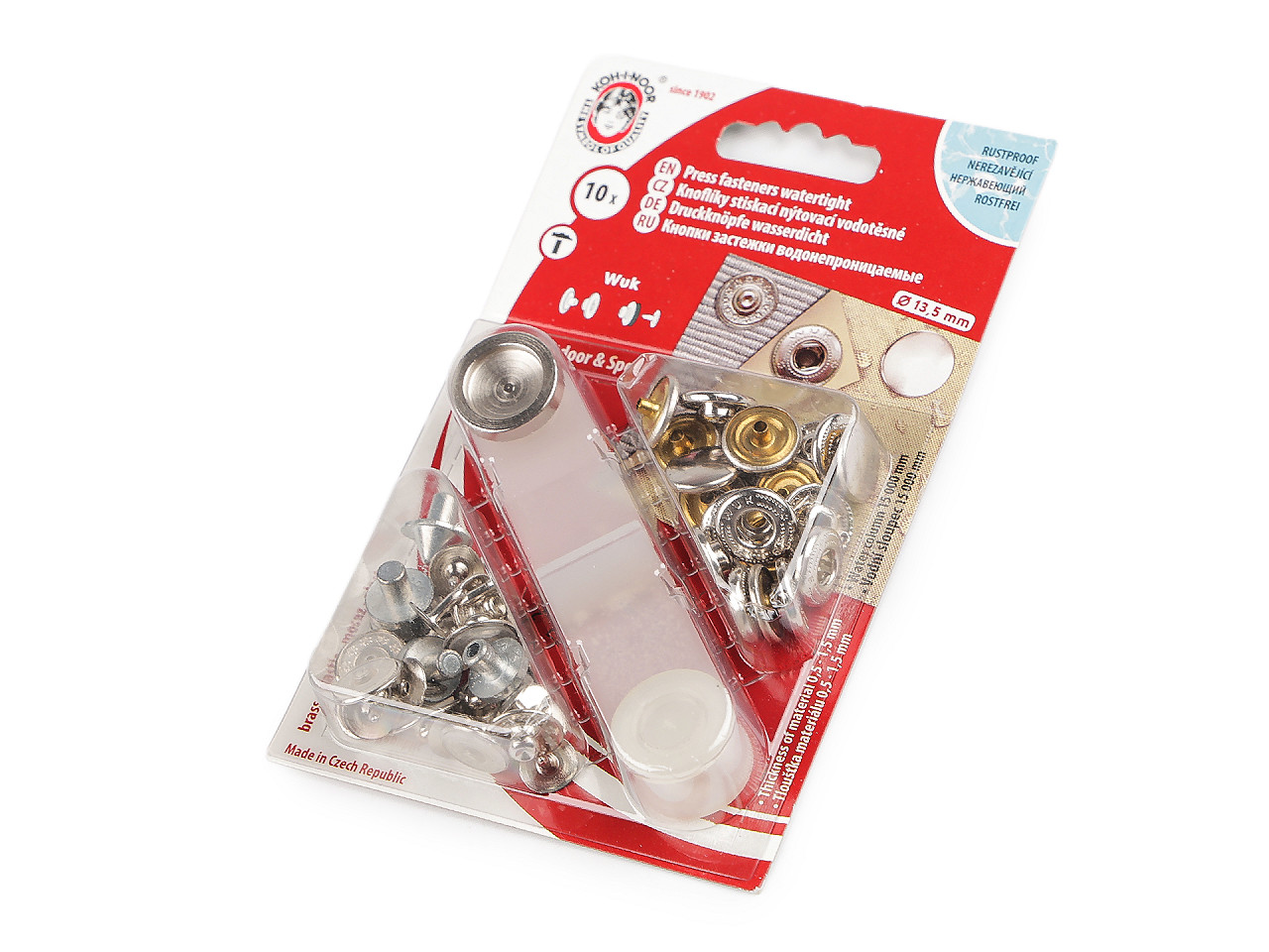 Vodotesné stláčacie gombíky sa perfektne hodia na športové odevy a na ochranné pracovné odevy pre vodohospodárov, vojakov alebo policajtov. Sú obzvlášť vhodné pre výrobky z vodeodolných materiálov , napríklad GORE-TEX. Vodný stĺpec je 15 000 mm H₂O. Nitovanie sa vykonáva malým plastovým lisom, ktorý je súčasťou balenia. Návod na nitovanie viď obrázok. Vhodné na hrúbku materiálu 0,5 – 1,5 mm.