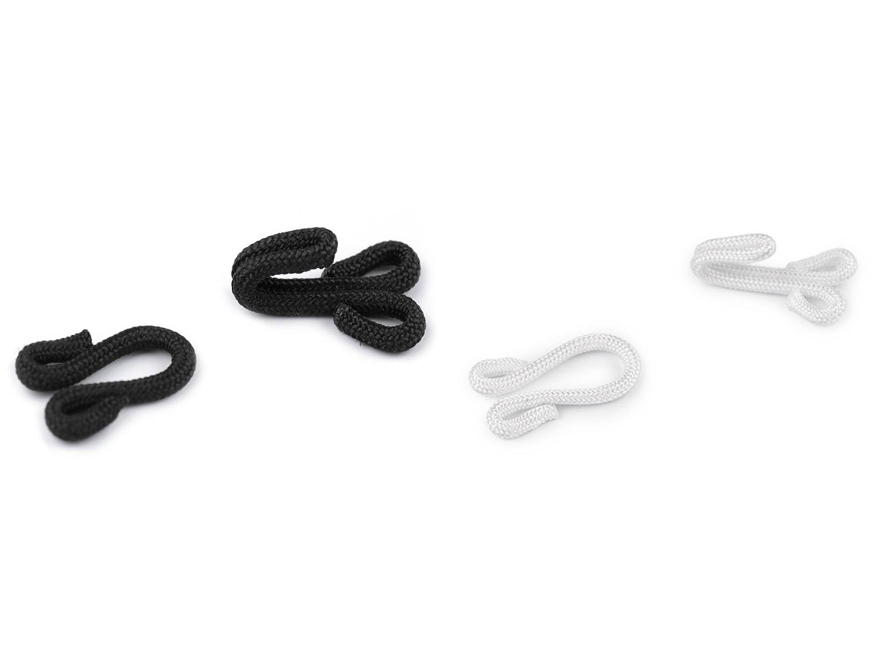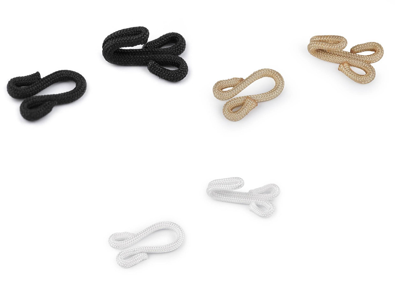 Kovový háčik s očkom je potiahnutý textíliou. Používa sa ako zapínanie na odevoch, najčastejšie na vestách alebo svetroch. Môžete ho využiť aj na tašky, kabelky a pod. Časť s háčikom má dĺžku 20 mm, časť s očkom má dĺžku 20 mm. Celková dĺžka po zapnutí je 36 mm.