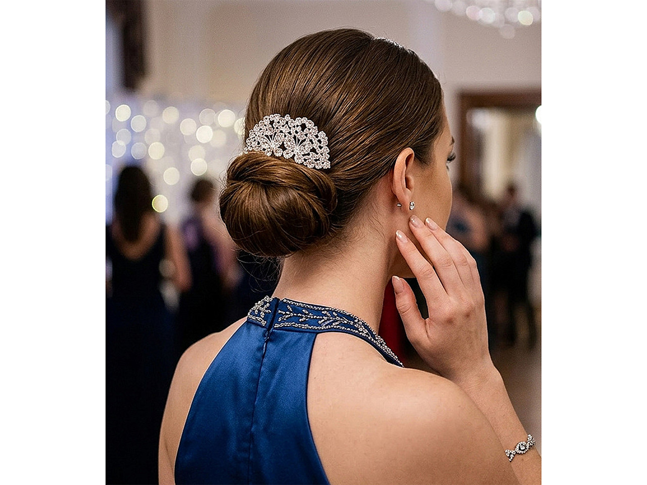 Kovovým hrebeňom do vlasov ozdobeným brúsenými kamienkami oslníte na každej slávnostnej udalosti, pretože sa blyští už z veľkej diaľky. Je vhodný do spoločenských účesov aj pre nevesty v ich deň. Samotný hrebeň je rovný, ozdoba je jemne prehnutá. V účese hrebeň pevne drží.