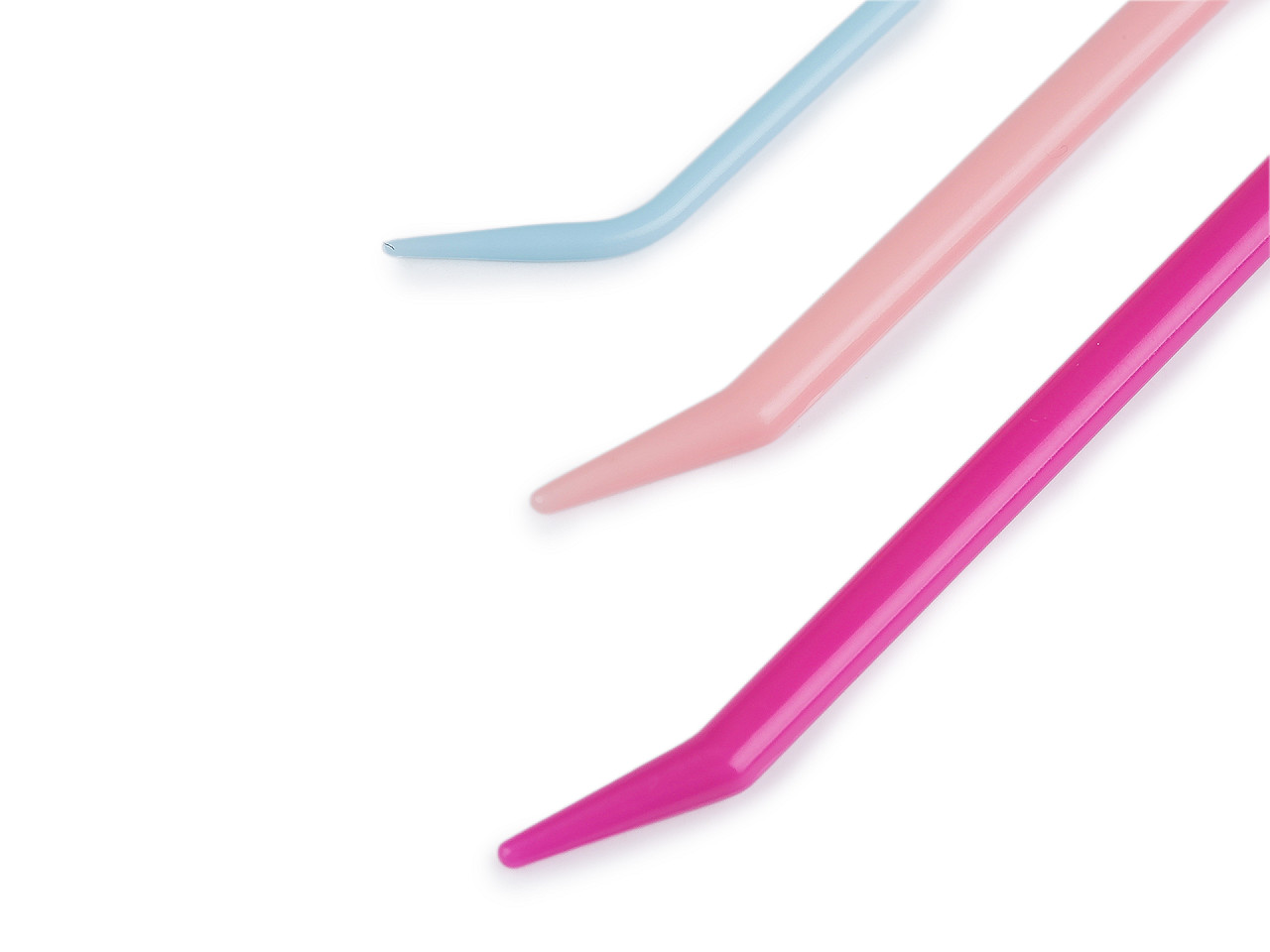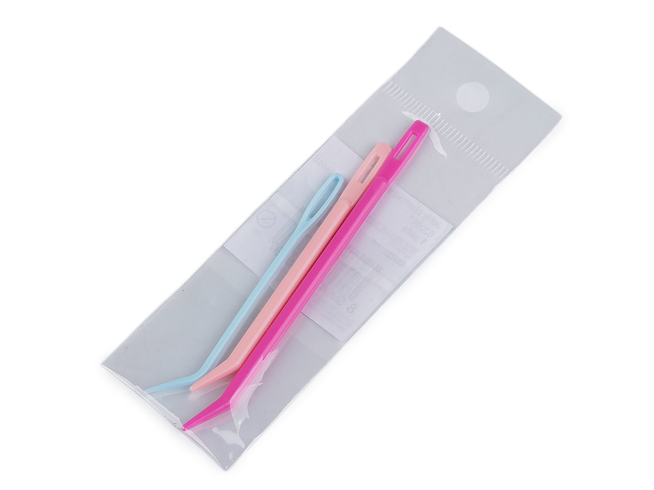 Plastové ihly so zahnutou špičkou využijete vďaka veľkému očku a tupej špičke na silnejšie priadze, na zošívanie či zapošívanie priadze u pletených aj háčkovaných výrobkov. Ihly sú ohybné a nelámu sa. Vonkajšie rozmery očka sú 1,5 x 4,5 mm a 2 x 4 mm. Vnútorné rozmery očka sú 1,2 x 8,5 mm a 1,9 x 12 mm.