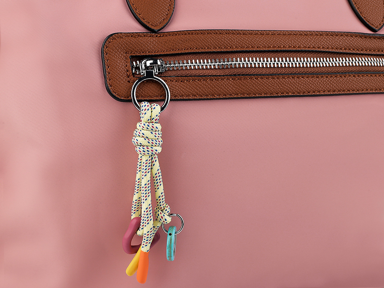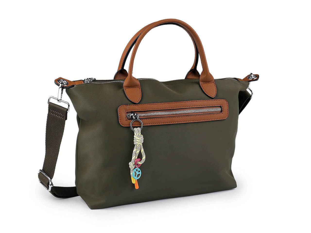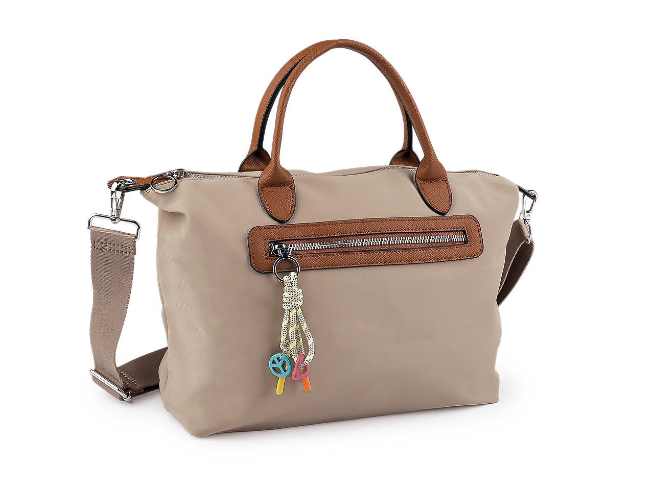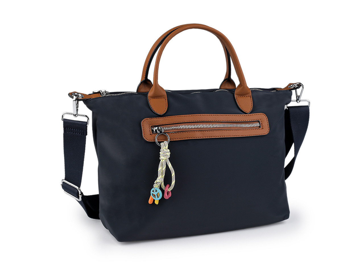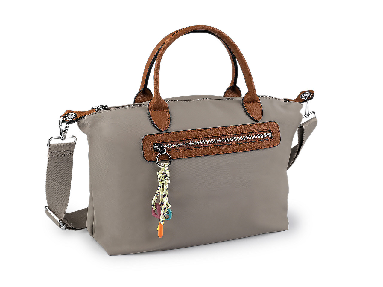 Módna kabelka prináša dokonalú kombináciu štýlu a funkčnosti. Je zo syntetického materiálu, ktorý vyzerá ako textil, má výhodu jednoduchej údržby , kabelku stačí len očistiť vlhkou handričkou. Zaujímavým prvkom je kontrastné lemovanie , ktoré kabelke dodáva jedinečný vzhľad. Súčasťou je aj ozdobný prívesok , ktorý pridáva kabelke na osobitosti. Kabelka sa uzatvára na zips. Vnútri nájdete tri postranné vrecká z ktorých jedno je na zips. Ďalšie dve zipsové vrecká nájdete z oboch vonkajších strán kabelky. Súčasťou kabelky sú uši a odnímateľný popruh na karabíny s reguláciou dĺžky. Kabelku môžete nosiť ako crossbody cez rameno alebo do kríža alebo len tak v ruke.