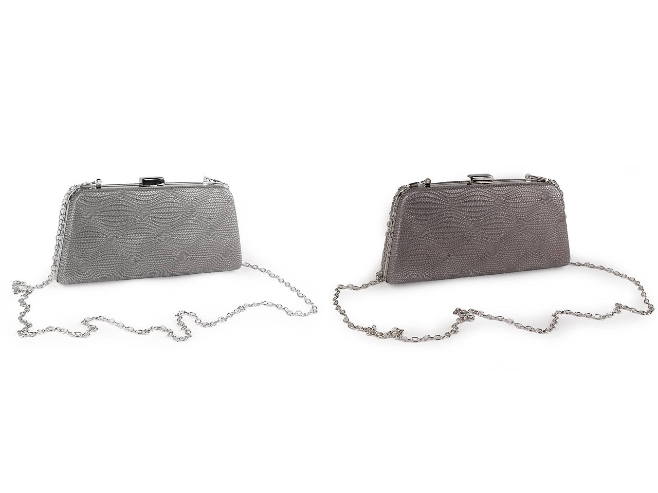 Malá spoločenská kabelka vyžaruje eleganciu a luxus, má zaujímavú lesklú povrchovú štruktúru , efektne sa trblieta. Zdobí ju výrazné lesklé zapínanie a rámček po celom obvode. Kabelka je pevne vystužená, jej súčasťou je dlhá odnímateľná retiazka na karabíny. Môžete ju nosiť v ruke alebo ako crossbody cez rameno alebo do kríža.