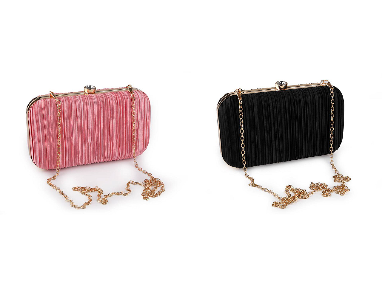 Luxusná spoločenská kabelka je skvelým doplnkom pre každú príležitosť, kedy chcete vyzerať štýlovo a elegantne. Zdobí ju textilný nariasený povrch s jemným leskom a výrazné lesklé zapínanie v tvare vsadeného brúseného kameňa . Kabelka je pevne vystužená, škrupinová, po celom obvode má kovový rámček. Jej súčasťou je dlhá odnímateľná retiazka na karabíny. Môžete ju nosiť v ruke alebo ako crossbody cez rameno či do kríža.