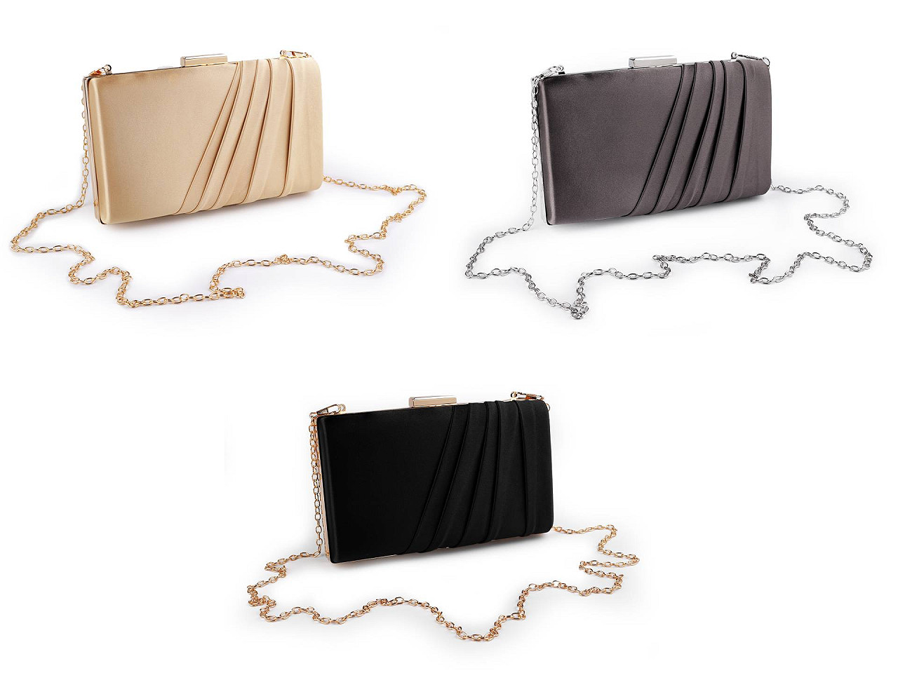 Malá spoločenská kabelka vyžaruje eleganciu a luxus. Jej povrch má saténový lesk . Na prednej strane je ozdobená zriasenou tkaninou . Kabelka má po celom obvode kovový rámček. Je pevne vystužená, jej súčasťou je dlhá odnímateľná retiazka na karabíny.