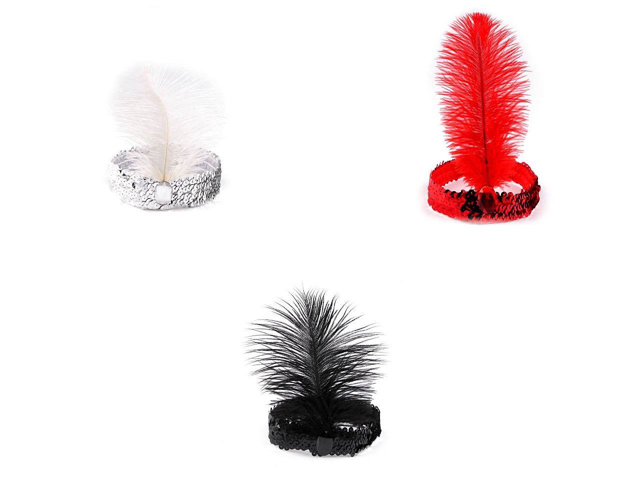 Karnevalová čelenka s ozdobným perím sa skvele hodí k elegantným retro kostýmom. Je elastická, prispôsobí sa svojej nositeľke. Vďaka flitrom sa efektne leskne.