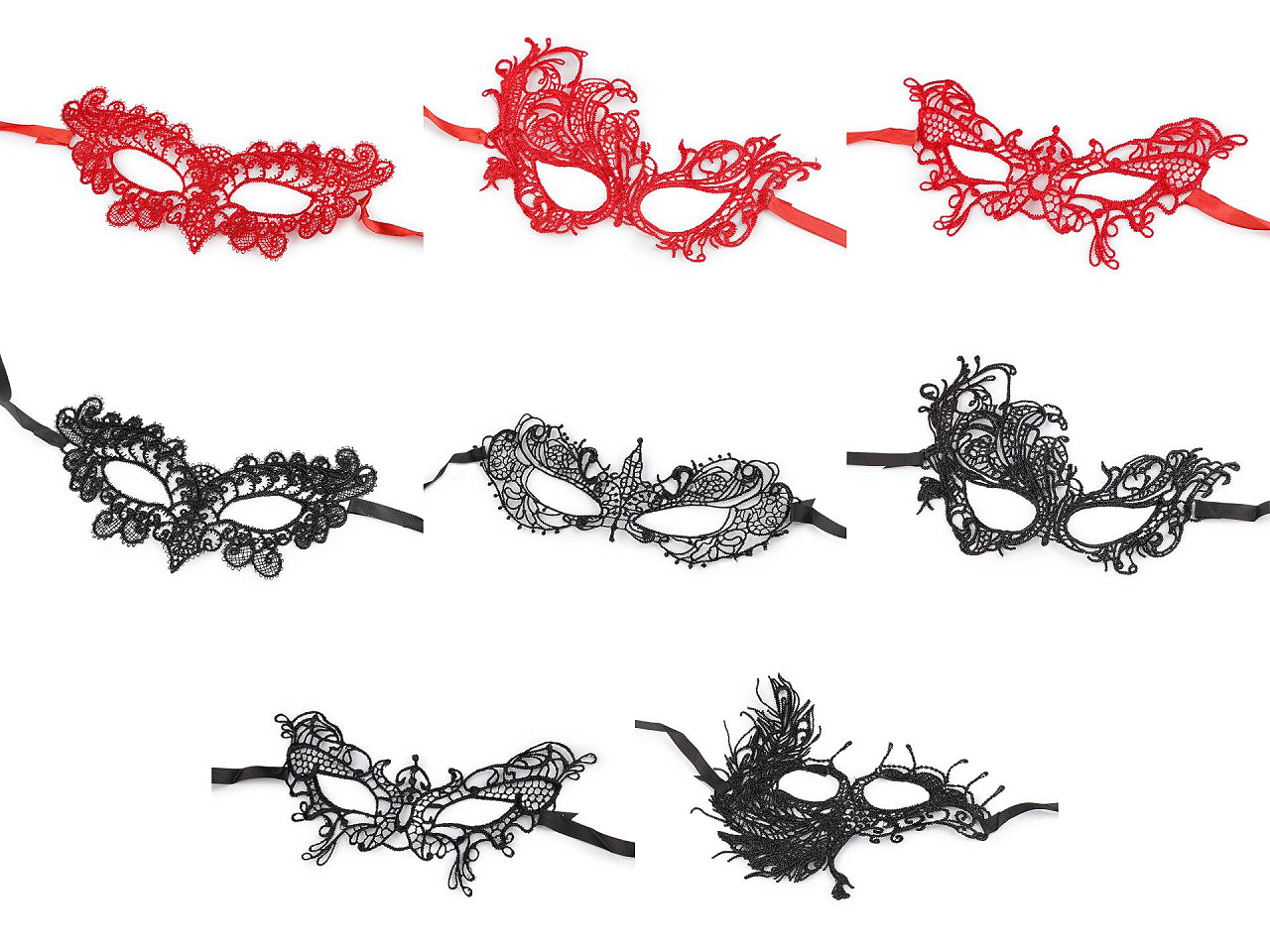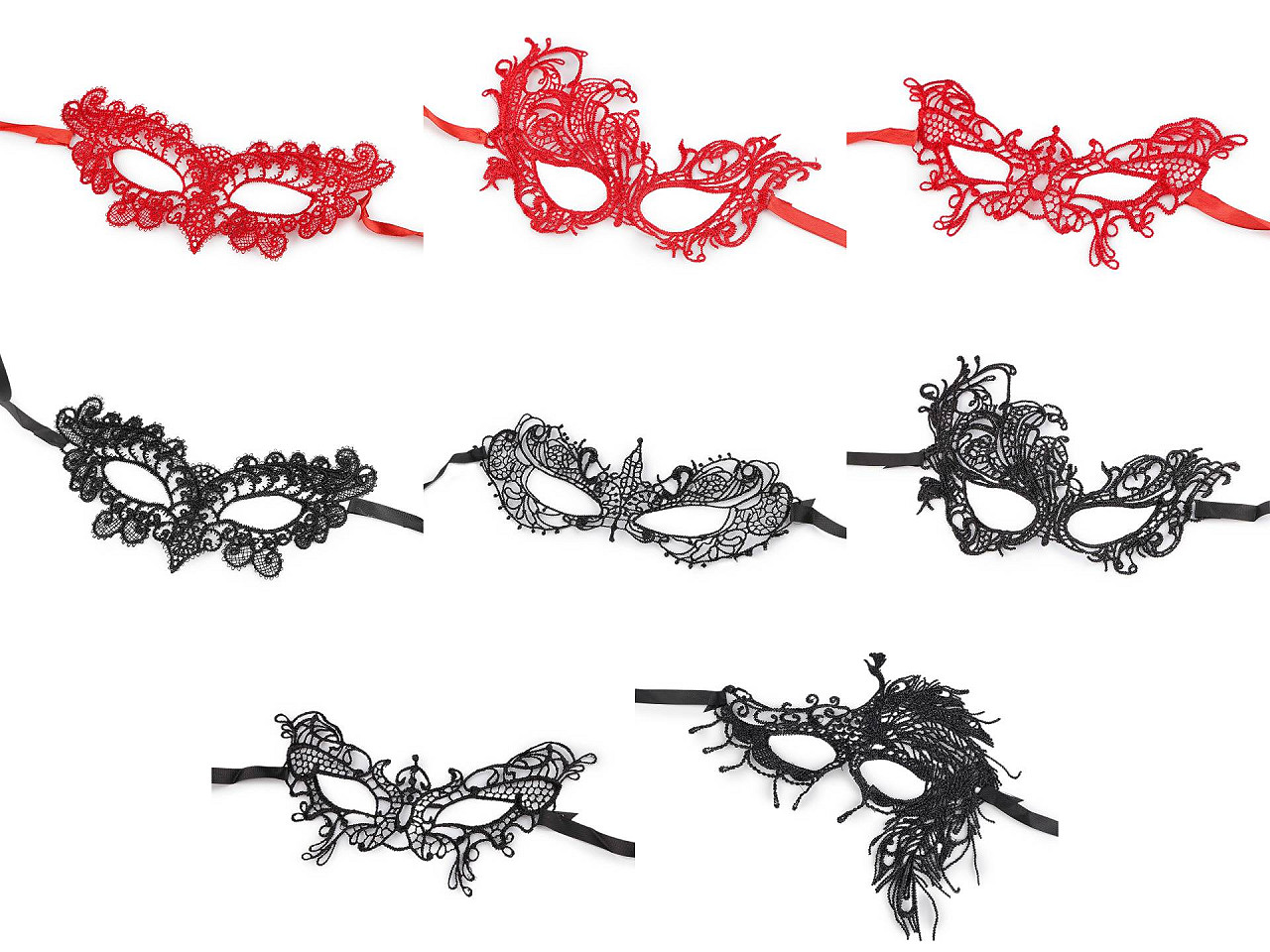 Čipkovú škrabošku využijete na večierky, párty, plesy, karneval a pod. Dodá vám zvodný a tajomný vzhľad. Zaväzovanie pomocou stuhy umožňuje ľahké prispôsobenie veľkosti a tvaru tváre, takže perfektne padne každému. Rozmery č. 1 a 4 sú 20 x 11 cm. Rozmery č. 2 a 6 sú 18 x 13 cm. Rozmery č. 3 a 7 sú 16,5 x 10 cm. Rozmery č. 5 sú 20 x 7,5 cm. Rozmery č. 8 sú 18,5 x 17 cm.