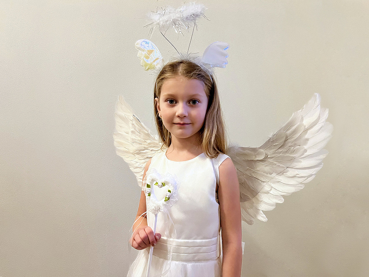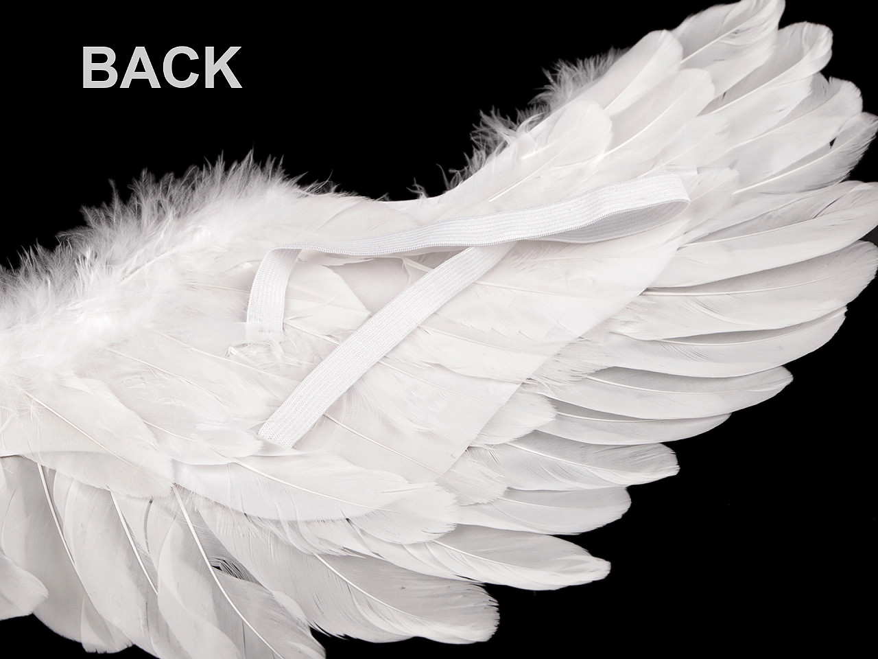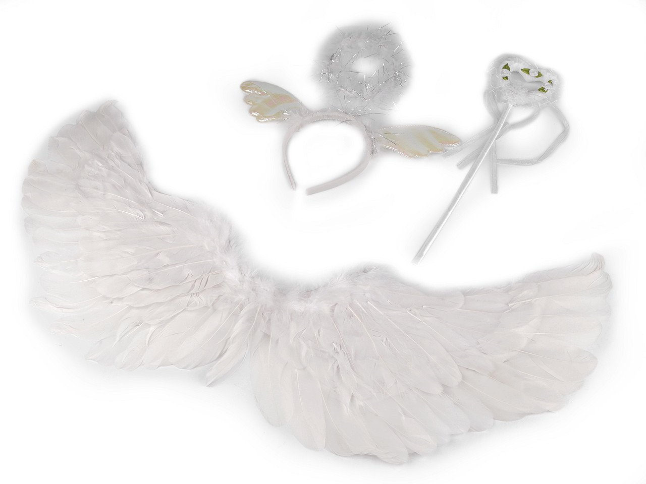S karnevalovým kostýmom sa každé malé dievčatko premení na roztomilého anjelika. Kostým sa skladá z páperových krídiel, paličky a čelenky so svätožiarou . Krídla sú obojstranné, bohato pokryté perím , nasadzujú sa pomocou gumičiek. Rozmery krídiel sú 40 x 62 cm. Obvod čelenky je 33 cm. Dĺžka paličky je 38 cm.