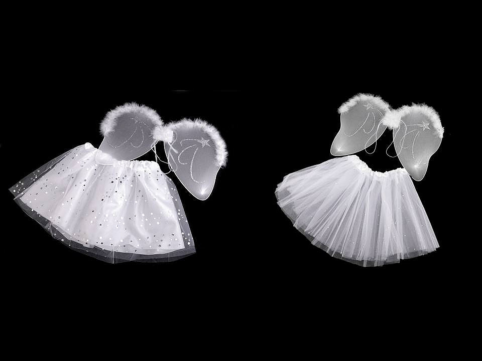 Kostým anjela sa skladá z tylovej sukienky a krídiel, ktoré sú vystužené a nasadzujú sa pomocou gumičiek. Rozmery krídiel sú 32 x 43 cm, dĺžka sukne je 32 cm, obvod pásu je 48 - 80 cm.