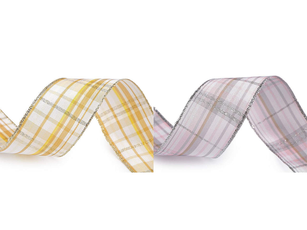 Károvaná stuha je veľmi kvalitná, obojstranná, má jemný lesk. Po stranách je ozdobená trblietavým lurexom , ktorý sa objavuje aj vo vzore kára. Vďaka kovovým drôtikom po stranách skvele drží tvar. Použitie: Stuhu môžete použiť na aranžovanie vencov či iných dekorácií alebo s ňou originálne zabaliť darčeky. Mašľa z tejto stuhy sa dá výborne tvarovať. Stuha môže mať v návine prestrih.
