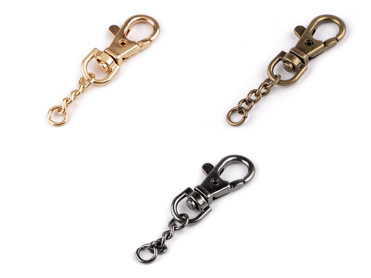 Otočnú karabínku s retiazkou využijete na výrobu kľúčeniek a pripevnenie retiazok na menšie kabelky či listové kabelky. Je vhodná aj na pripevnenie príveskov k taškám, kabelkám a batohom. Dĺžka retiazky je 28 mm.