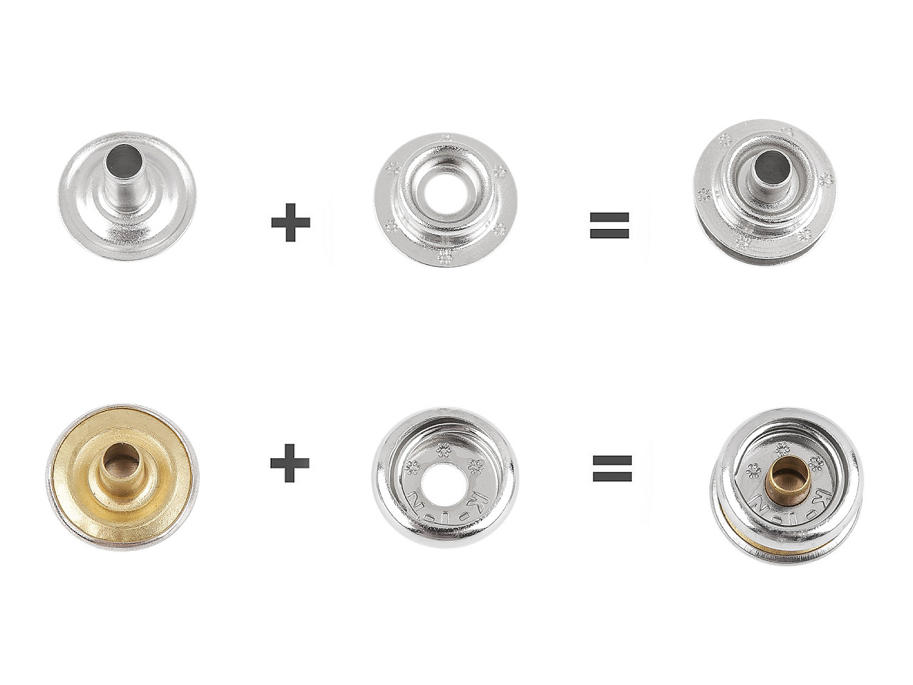 Stláčacie gombíky sú určené na spájanie hrubých látok s hrúbkou 3 - 5 mm (ideálne na kožu a koženky). Nitovanie sa vykonáva lisom a pistonom . Výška vrchného nitu je 7,5 mm a výška spodného nitu je 9,9 mm. Sada sa skladá zo 4 dielov.