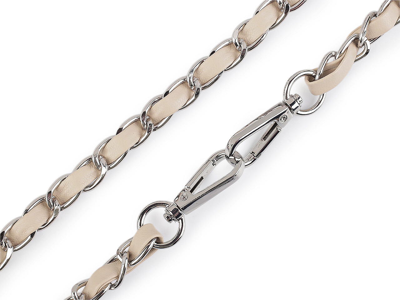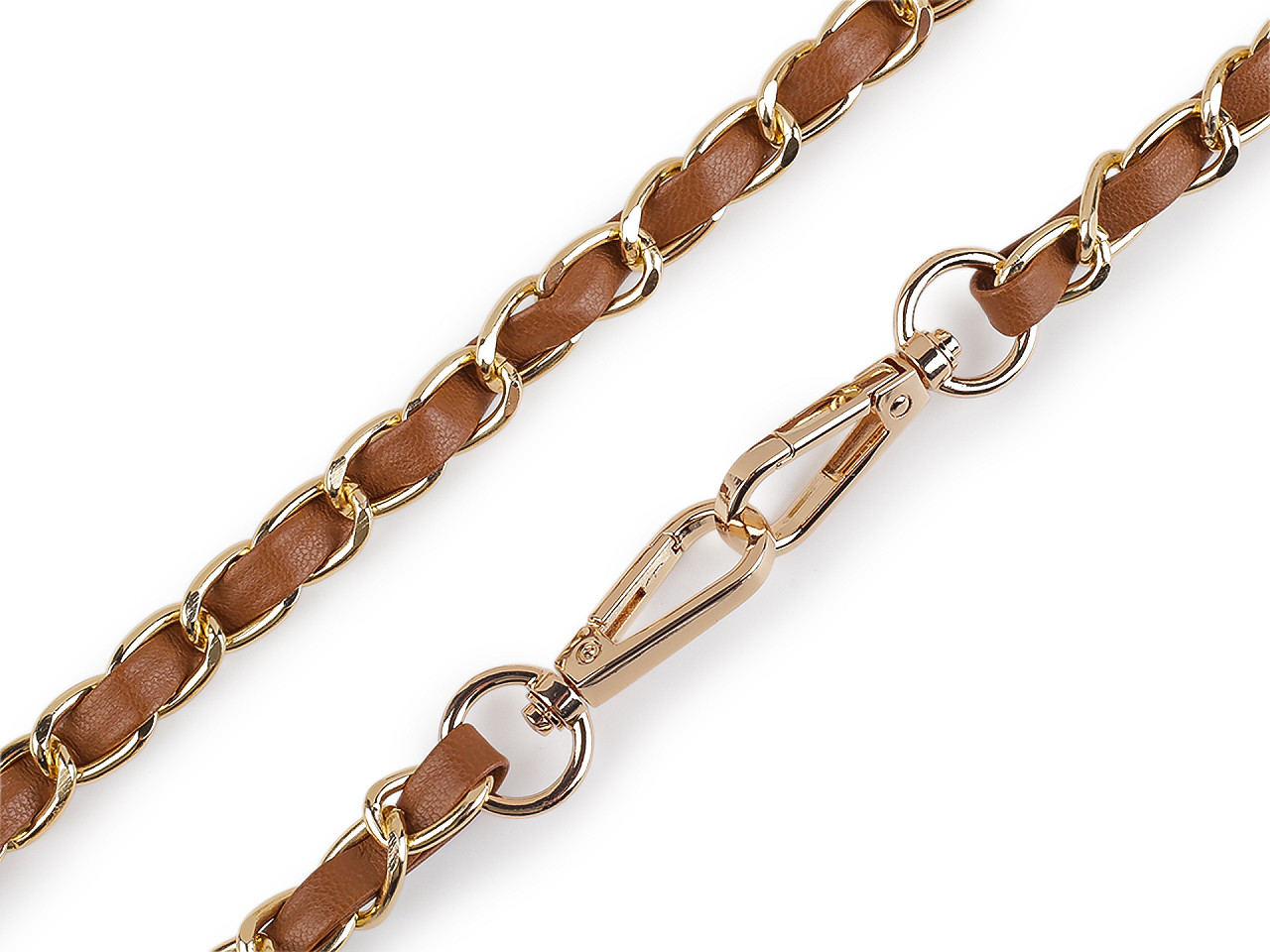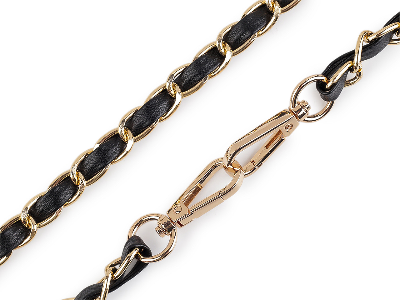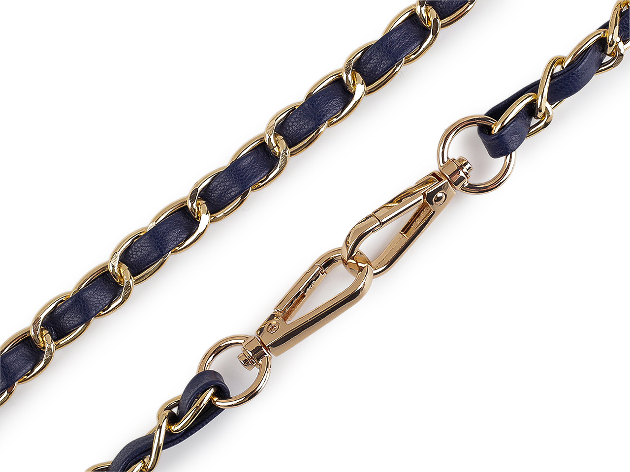 Kovová retiazka je efektne prepletená remienkom z eko kože. Využijete ju na menšie kabelky, listové kabelky alebo puzdrá na mobilné telefóny. Na oboch jej koncoch nájdete pripevnené karabínky. Retiazka nie je určená na veľkú záťaž.
