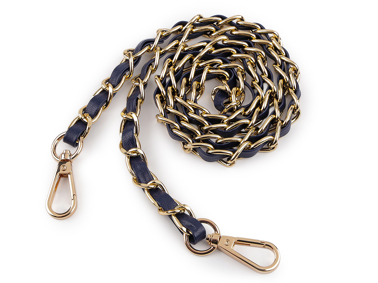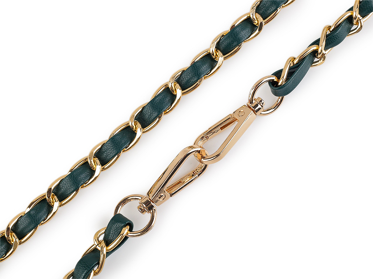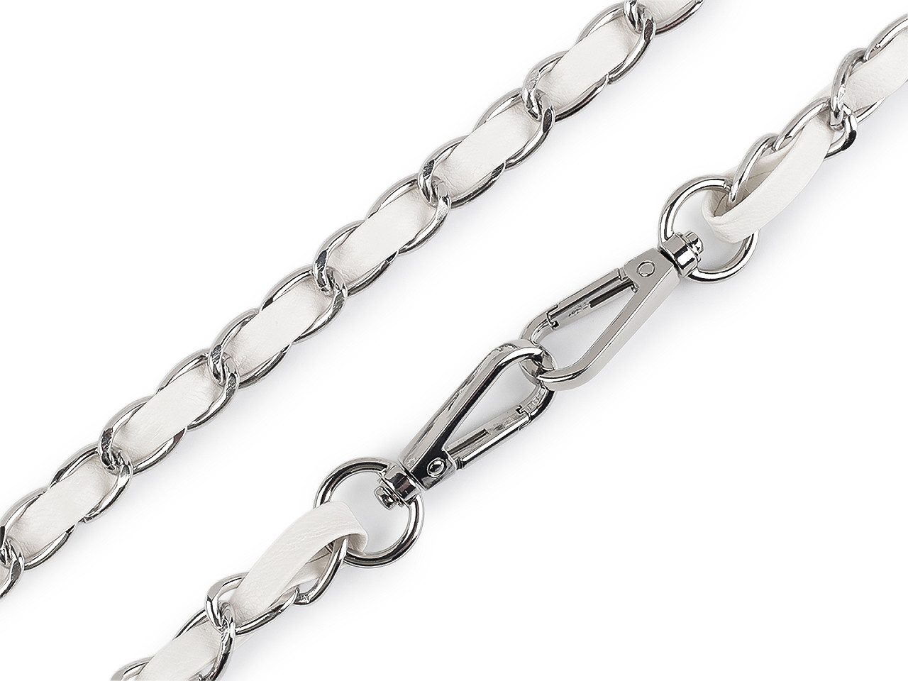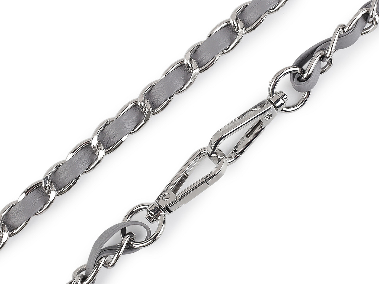 Kovová retiazka je efektne prepletená remienkom z eko kože. Využijete ju na menšie kabelky, listové kabelky alebo puzdrá na mobilné telefóny. Na oboch jej koncoch nájdete pripevnené karabínky. Retiazka nie je určená na veľkú záťaž.