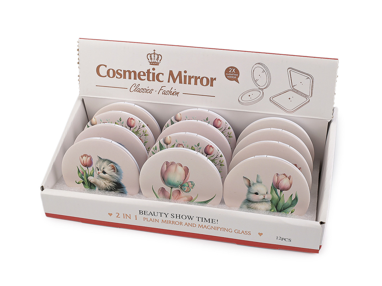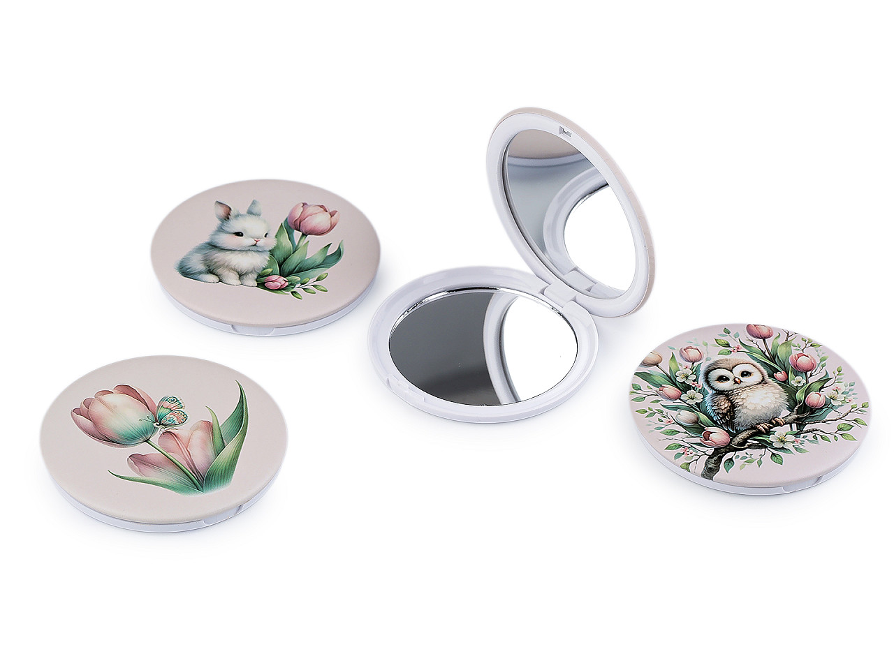 Kozmetické zrkadlo s potlačou zvieratka je ideálnym spoločníkom na každodenné použitie. Je ploché , plastové a ľahké, ľahko sa zmestí do každej kabelky či kozmetickej taštičky. Jeho dizajn s roztomilými zvieratkami a kvetinovým motívom dodáva produktu jemný a hravý vzhľad , ktorý poteší nielen deti, ale aj dospelých, je skvelým pomocníkom pre opravu make-upu počas dňa. Vnútri sú 2 zrkadlá .