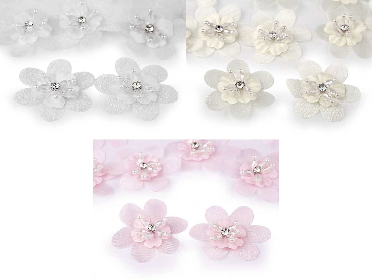 Elegantný kvet so zdobeným stredom je zložený z 2 vrstiev. Spodná časť kvetu je tuhá organza, horná časť je zosilnená a tvarovaná . Stred je ručne dozdobený brúseným kamienkom v kotlíku a korálkami , pôsobí veľmi romanticky. Brúsený kamienok v strede kvetu dodáva trblietavý efekt, zatiaľ čo korálky rozprestreté po okvetí zaisťujú bohatý a výrazný vzhľad. Použitie: Kvet môžete našiť či nalepiť na svetríky, blúzky, šaty, kabátiky, listové kabelky, tašky alebo vlasové ozdoby, klobúky a čiapky.