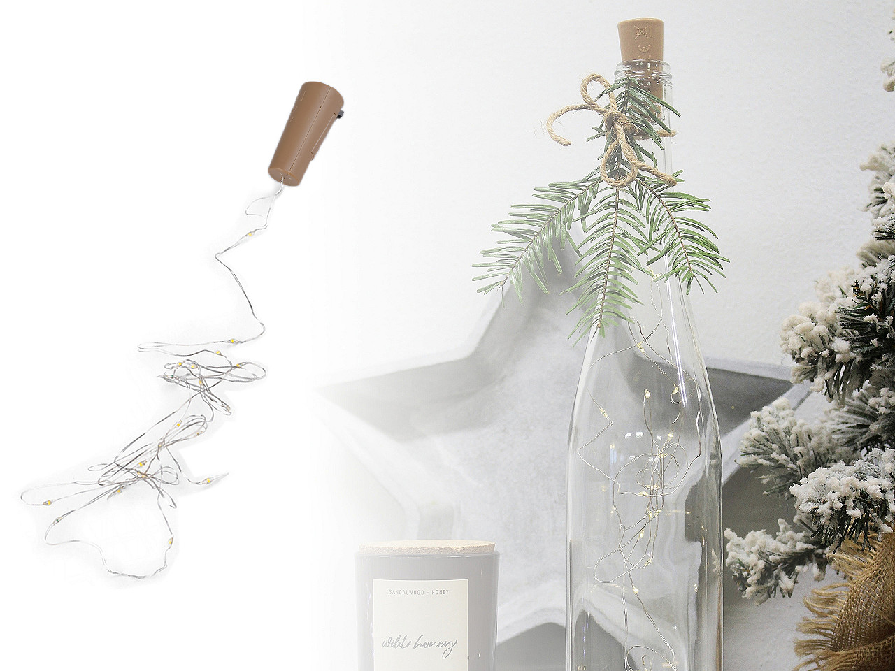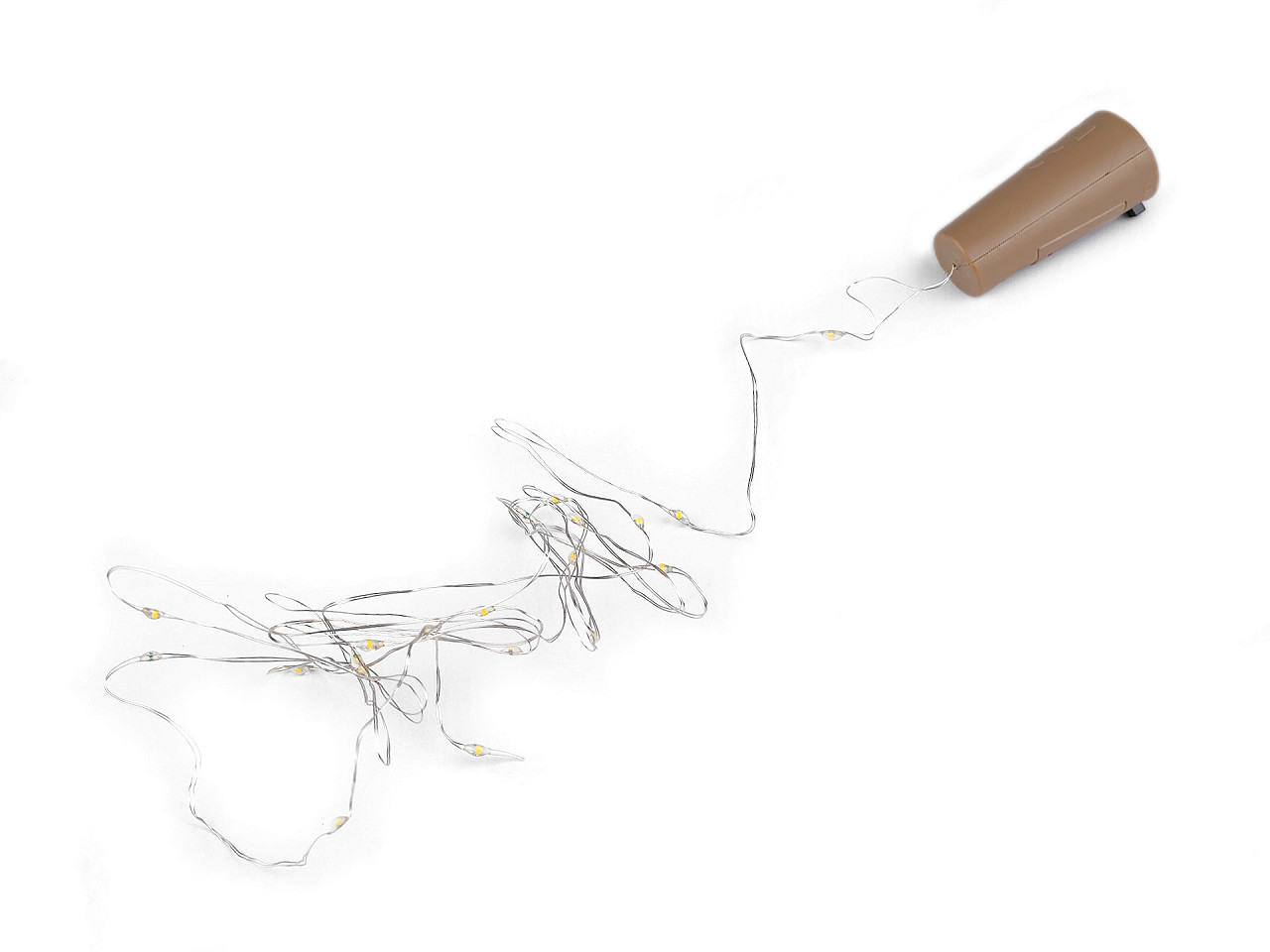 LED osvetlenie v podobe zátky využijete na akékoľvek prázdne sklenené fľaše (od vína, piva, liehovín a pod.) Nájdete na ňom 20 LED diód . Vďaka drôtu ho môžete aj dobre tvarovať. Dekorácia svieti teplým svetlom, nebliká. Zátka je vhodná na celoročné použitie. Batérie (3x LR44) sú súčasťou balenia. Horný priemer zátky je 2,2 cm, dolný priemer je 1,5 cm. Dĺžka zátky je 4,7 cm.