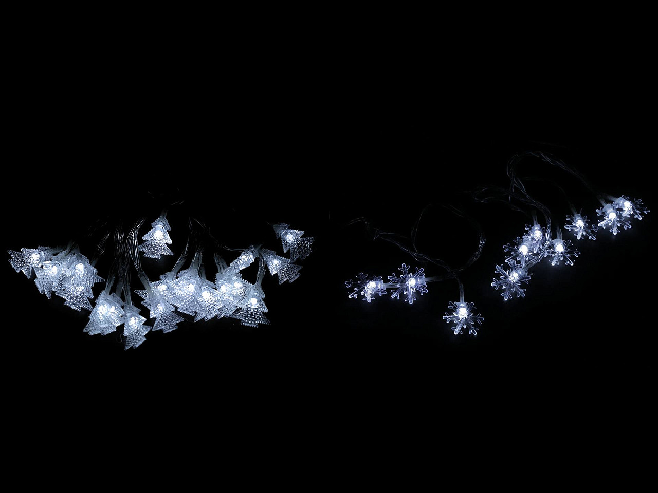 Na svetelnej reťazi nájdete 20 LED diód . Rozostup medzi jednotlivými svetielkami je 15 cm. Reťaz svieti, nebliká. Reťaz je na 3 kusy AA batérií, ktoré nie sú súčasťou. Je určená na vnútorné použitie. Priemer hviezdy je 3,5 cm a svieti studeným svetlom. Je tu 10 diód a reťaz je na 2ks AA batérií. Priemer vločky je 3 cm a svieti studeným svetlom. Rozmery stromčeka sú 2,5 x 3 cm a svieti studeným svetlom.