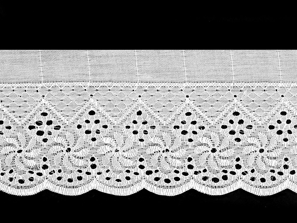 Madeira má zaujímavý vzor s dierkovanou výšivkou. Okraj je zakončený pravidelnými oblúčikmi.
