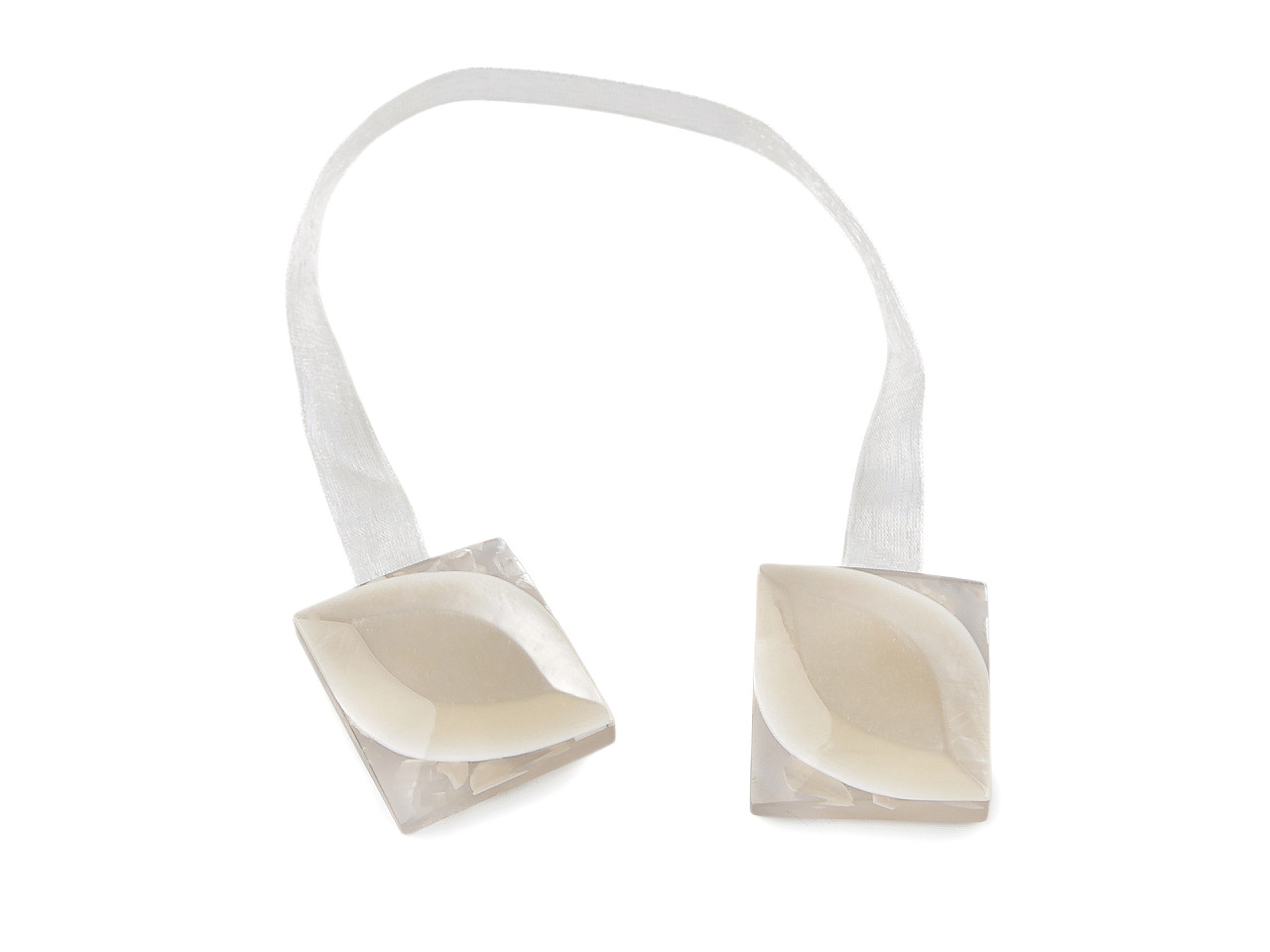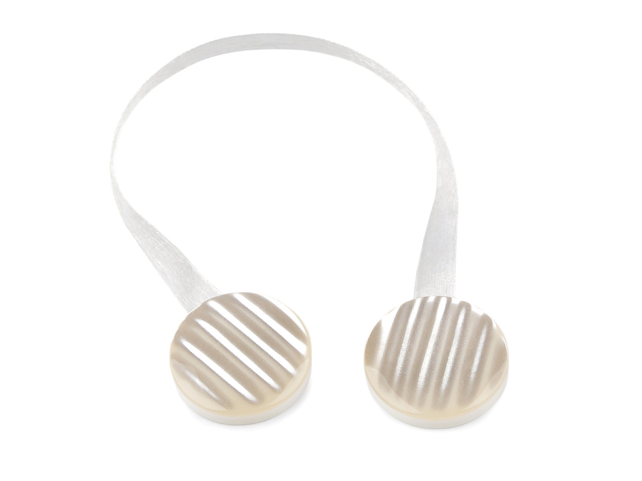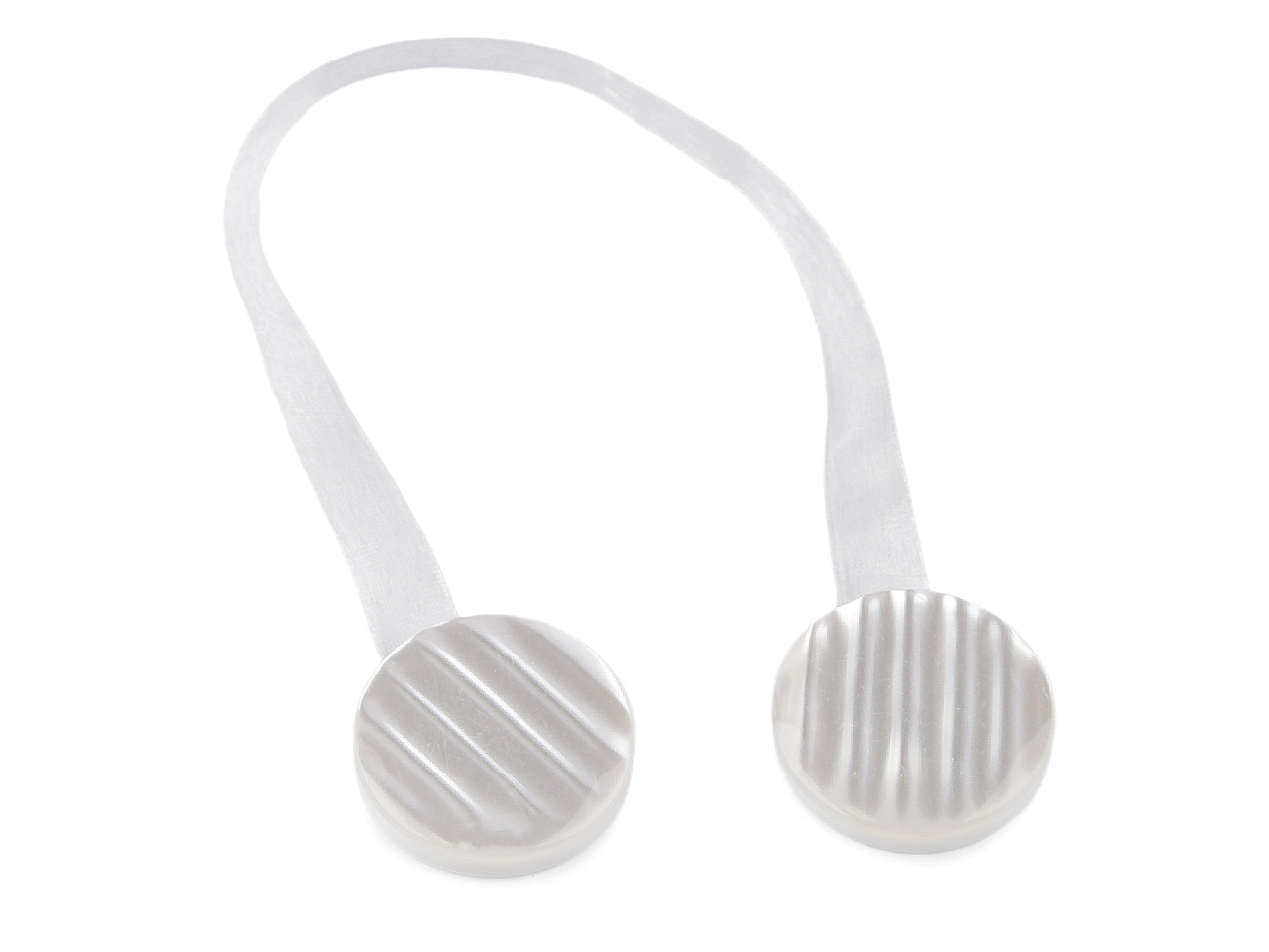 Magnetickú sponu využijete na zopnutie závesov alebo záclon. Zopnutie spony je rýchle a praktické vďaka silným magnetom na spodnej strane. Spona je spojená lesklou šifónovou stuhou. Spony sú v 2. akosti, pretože sa na nich vyskytujú škrabance a preliačiny.