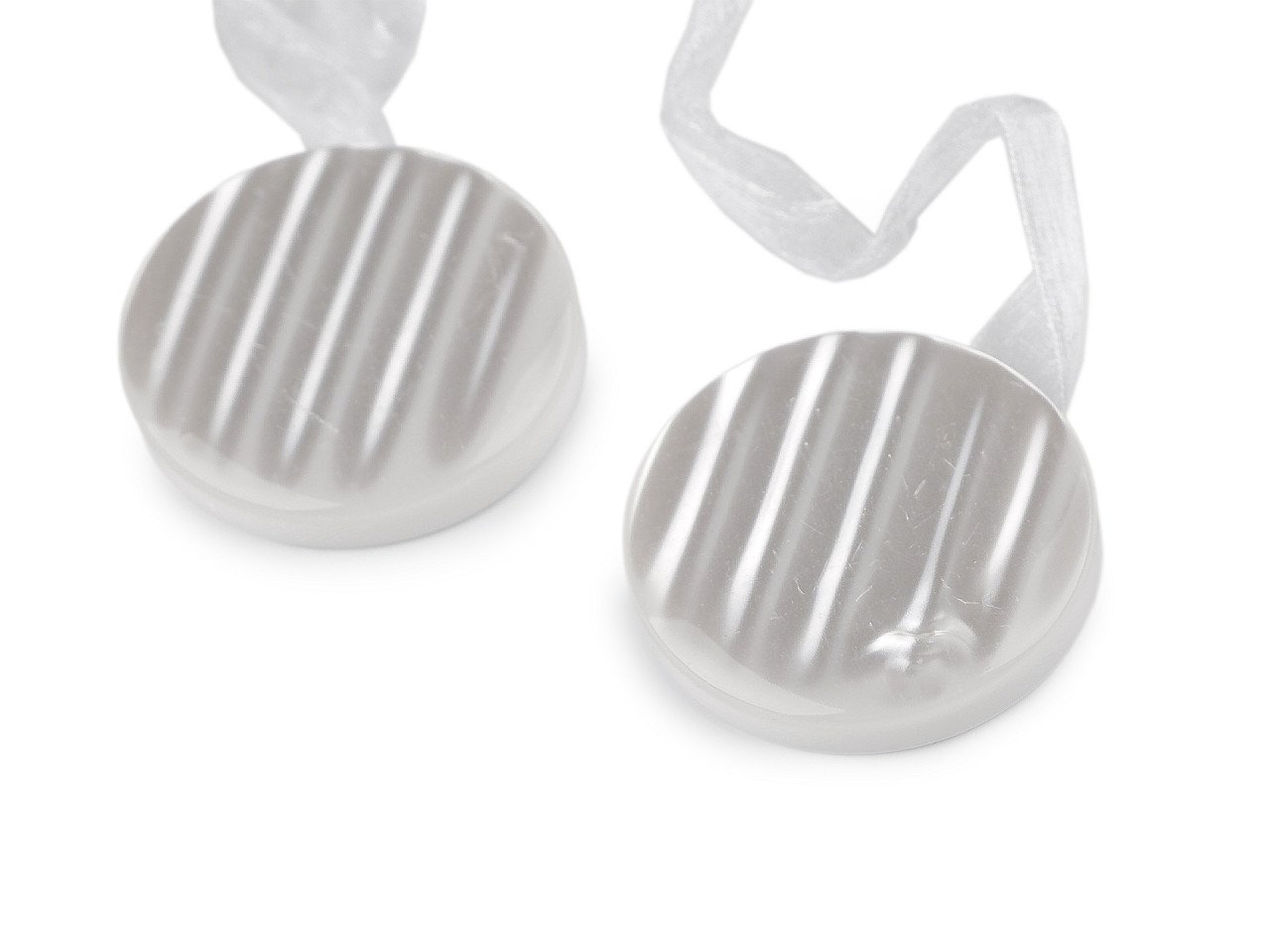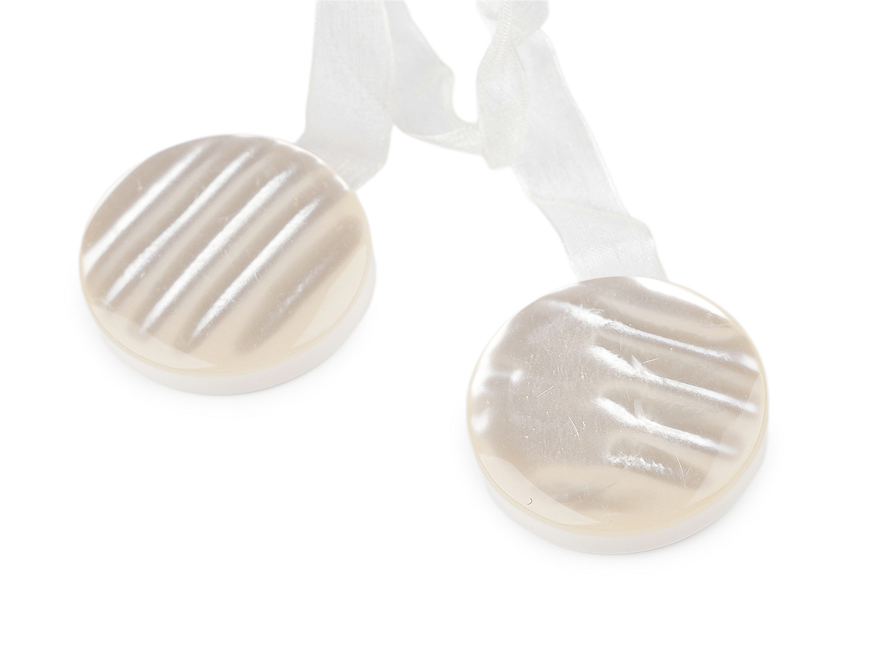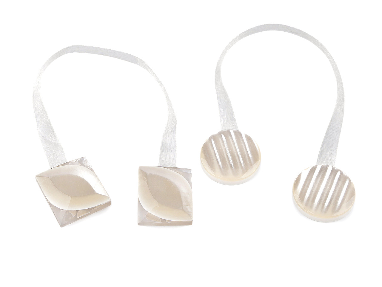 Magnetickú sponu využijete na zopnutie závesov alebo záclon. Zopnutie spony je rýchle a praktické vďaka silným magnetom na spodnej strane. Spona je spojená lesklou šifónovou stuhou. Spony sú v 2. akosti, pretože sa na nich vyskytujú škrabance a preliačiny.