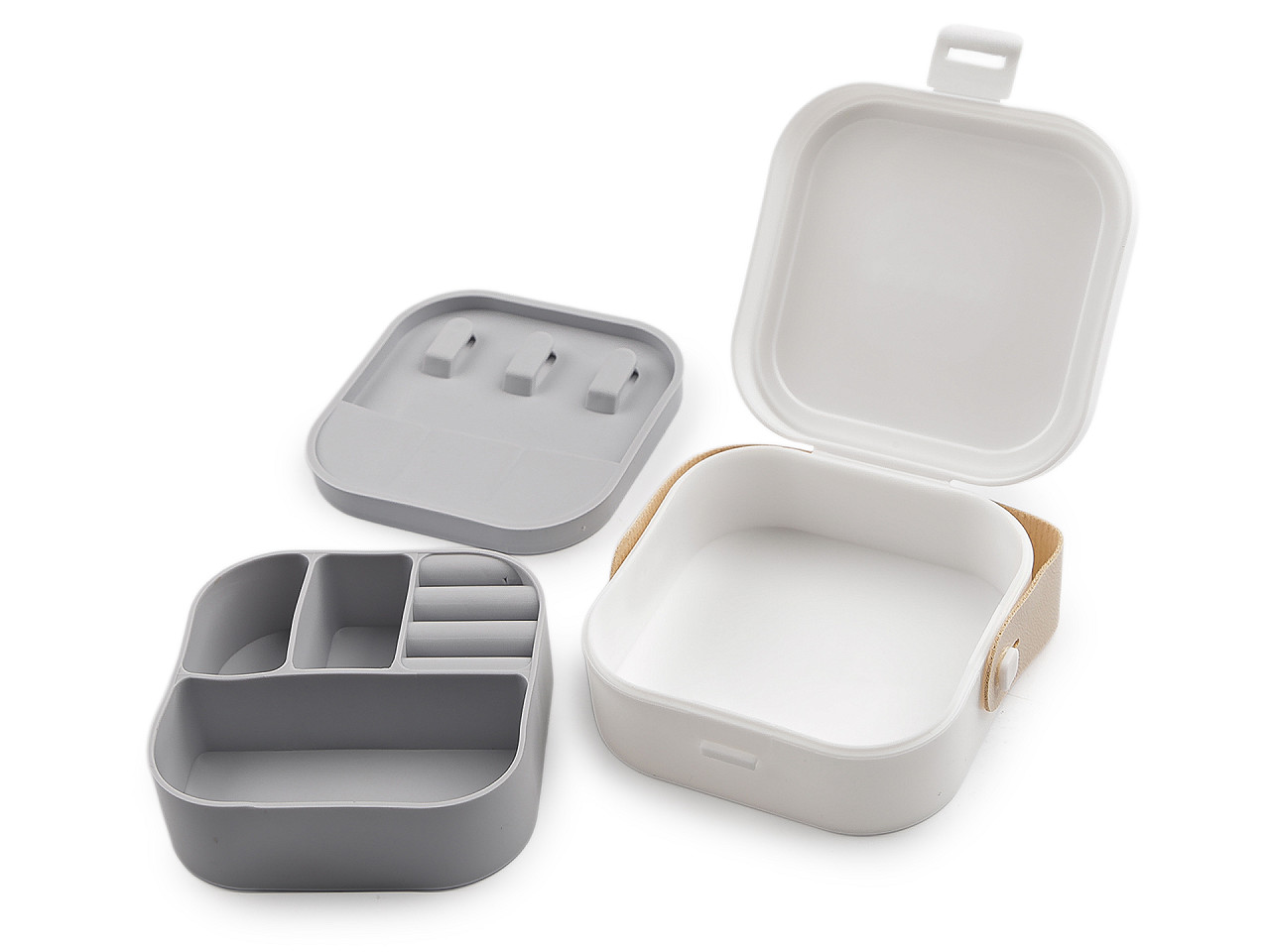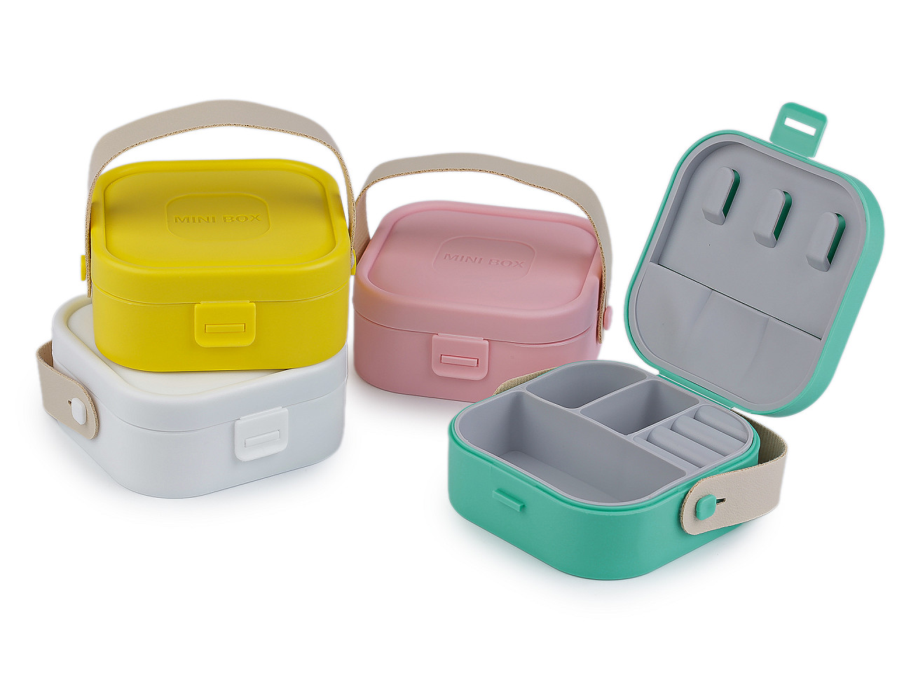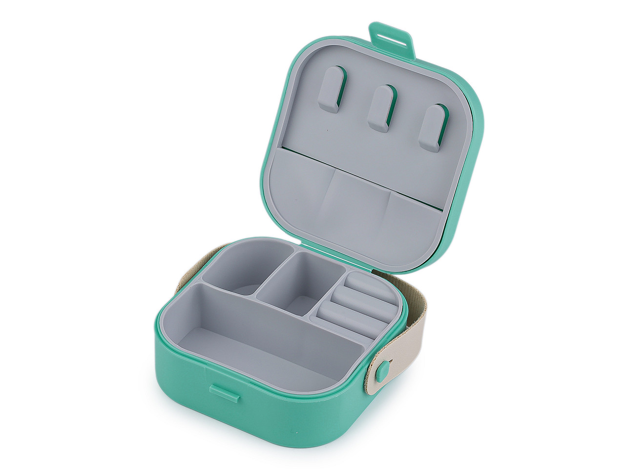 Malá štýlová šperkovnica poskytuje bezpečné úložisko pre vaše šperky. Je vyrobená z kvalitného plastového materiálu , ktorý je odolný a ľahko sa čistí . Ponúka optimálnu ochranu, jej kompaktný tvar s odnímateľným koženkovým uchom do ruky umožňuje ľahké prenášanie, či už ju chcete mať v kabelke alebo cestovnej taške. Vnútri - vo veku - nájdete 3 háčiky s priehradkami na zavesenie retiazok. Vo vnútri nájdete 3 priehradky a oddiel na náušnice či prstene. Všetky vložené silikónové časti vo vnútri šperkovnice sa dajú vybrať a využiť napríklad samostatne na nočnom stolíku.
