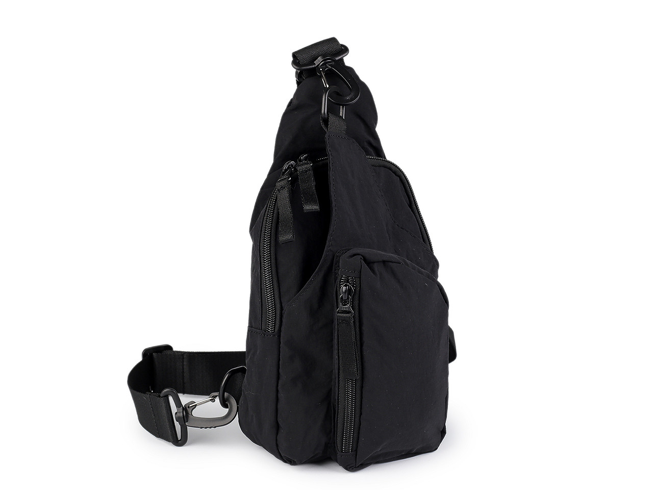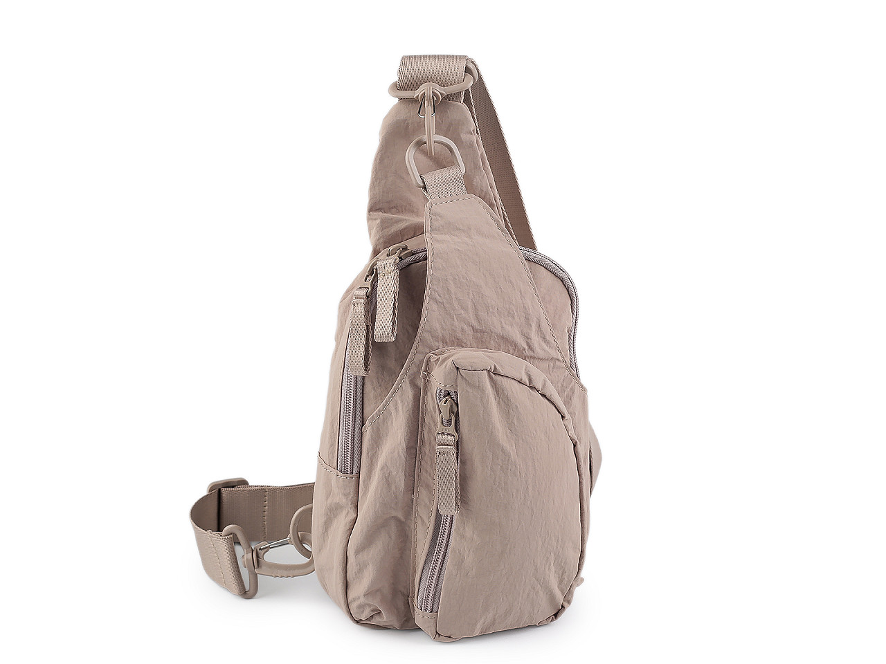Pohodlný a praktický crossbody batoh na jedno rameno aj cez hruď je ideálny do mesta, na výlety aj na festivaly. Vďaka textilu, z ktorého je vyrobený, má malú hmotnosť. Na prednej strane má niekoľko vreciek, z toho je jedno na zips. Hlavné vrecko sa uzatvára na zips, vo vnútri má ploché vrecko aj vrecko so zipsom na uloženie cenných drobností. Posledné ploché vrecko je na zadnej strane batoha. Popruh je nastaviteľný s plynulou reguláciou dĺžky, na jednom konci má odopínaciu karabínu.