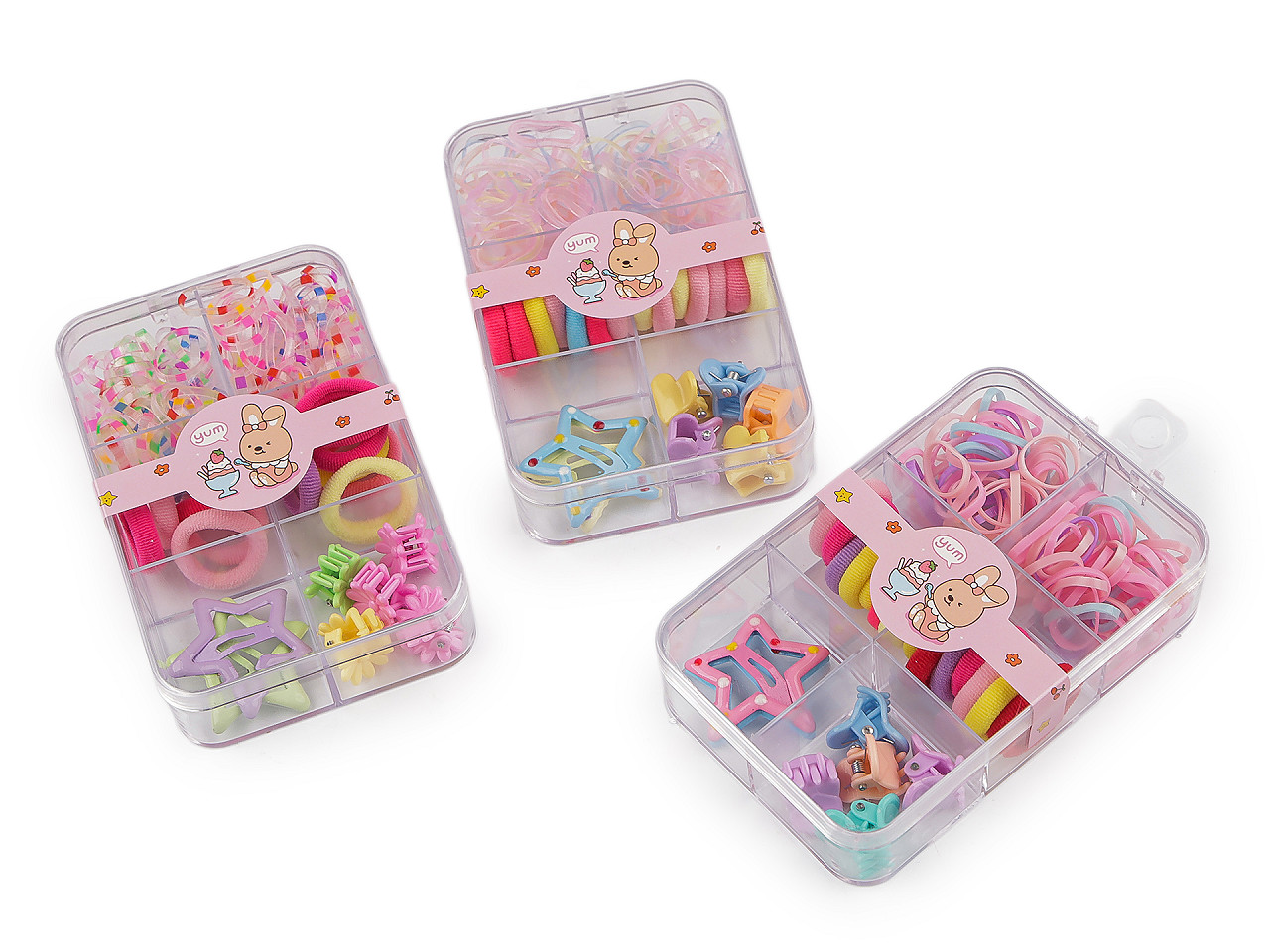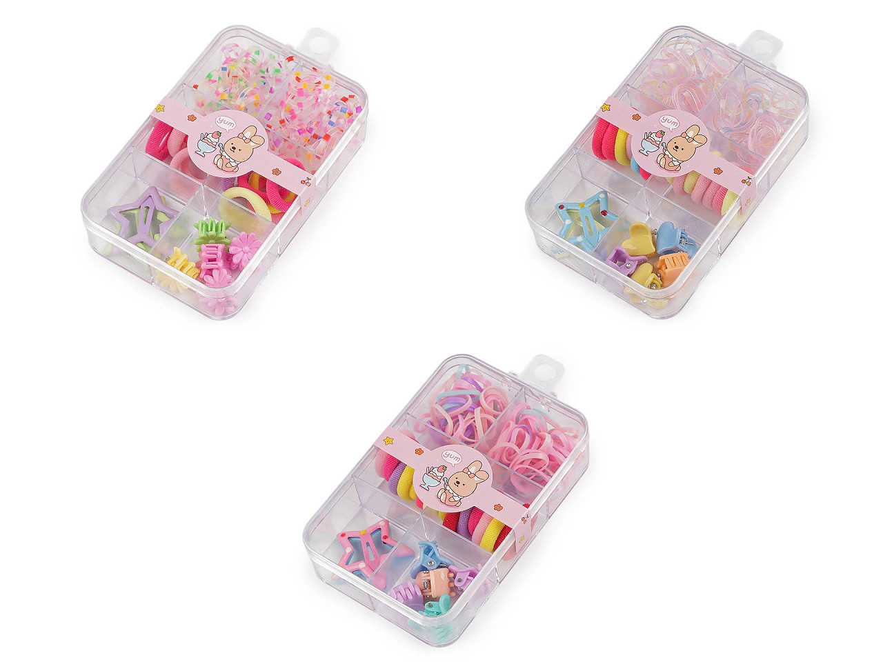 Súprava malých štipcov do vlasov, gumičiek a 2 sponiek je ideálna pre dievčatká, ktoré rady vytvárajú zaujímavé účesy. Dievčatá si môžu so štipcami zopnúť malé pramienky jemných detských vláskov a urobiť si veľa vrkôčikov. Sada obsahuje 5 štipcov, 14 textilných gumičiek, cca 85 silikónových mini gumičiek a 2 pukačky hviezdičky . Je uložená v praktickom plastovom boxe, ktorý je rozdelený na 6 priehradok. Box je možné zavesiť.