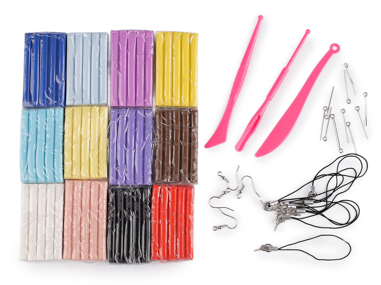 Sada modelovacích polymérových hmôt obsahuje 12 ks rôznych farieb . Vnútri balenia nájdete aj modelovacie náradie a bižutérne komponenty - afroháčiky, pútka a ketlovacie ihly. (Jednotlivé bižutérne komponenty sa v baleniach môžu líšiť). Polymérová hmota sa svojou konzistenciou podobá hmote Fimo. Po premiesení je dostatočne jemná , dá sa ľahko miešať (blendovať). Zároveň je dostatočne pevná , udrží jemné detaily pri využití špecializovaných techník. Hotové výrobky sú veľmi trvanlivé a odolné. Je ideálna na výrobu šperkov, domácich dekorácií a predmetov, ktoré používame každý deň. Vymodelovaný výrobok sa zapečie v elektrickej rúre pri 110 - 130 ° C po dobu 15 - 30 minút. Návod na použitie: Hmotu premieste a vytvarujte. Na vypracovanie sú vhodné napr. modelovacie špachtle. Vymodelovaný predmet na alumíniovej fólii alebo na sklenenej doske vložte do elektrickej rúry, predhriatej na min. 110°C a nechajte vytvrdiť max. 30 min. Nie je určené do mikrovlnnej rúry! Skladovanie: Hmotu skladujte v alumíniovej fólii alebo PE sáčkoch pri izbovej teplote. Hmota nesmie prísť do styku s polystyrénom, PVC a penovým polystyrénom.