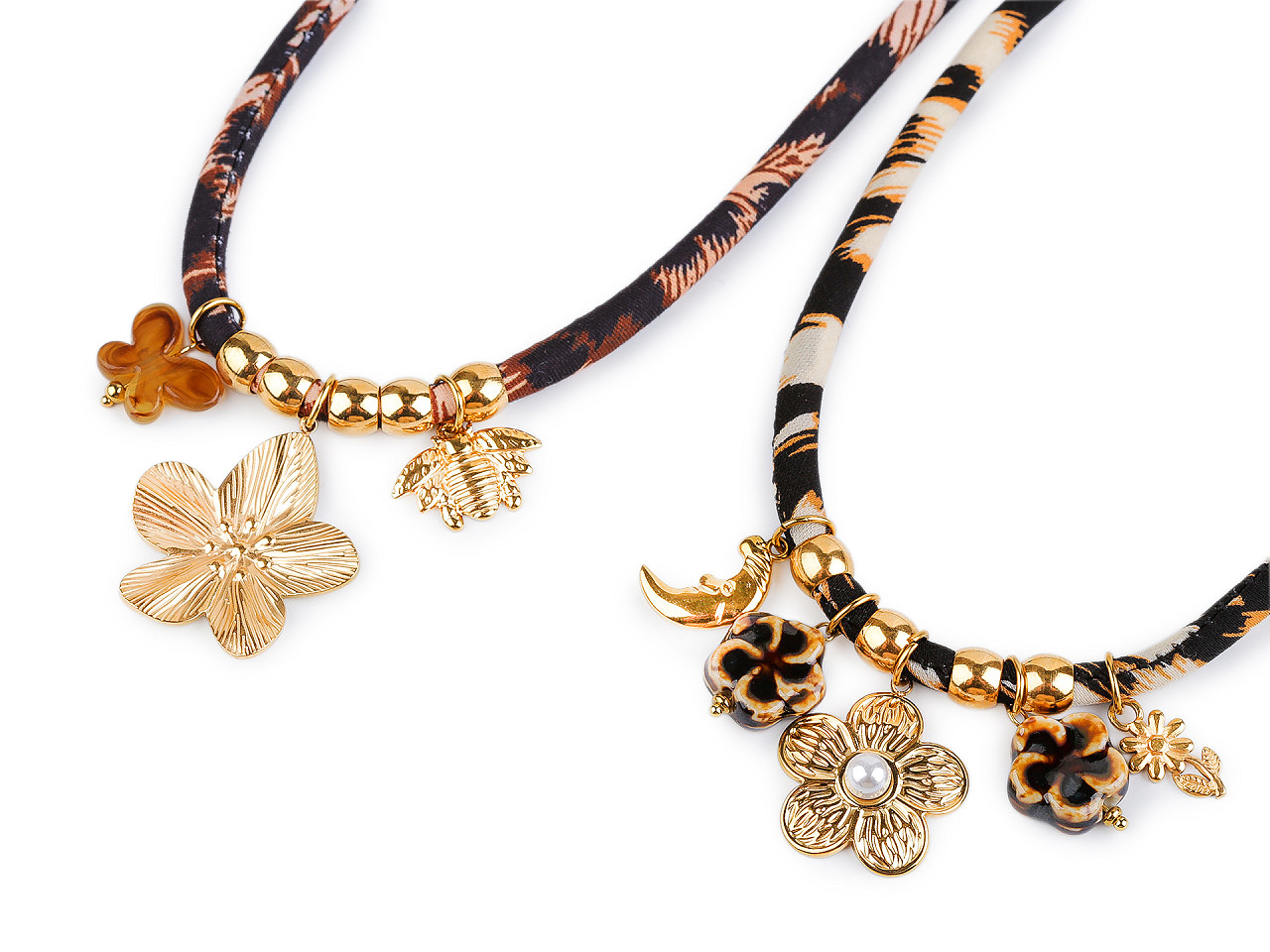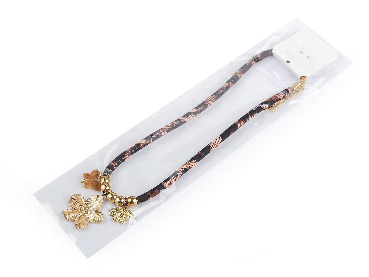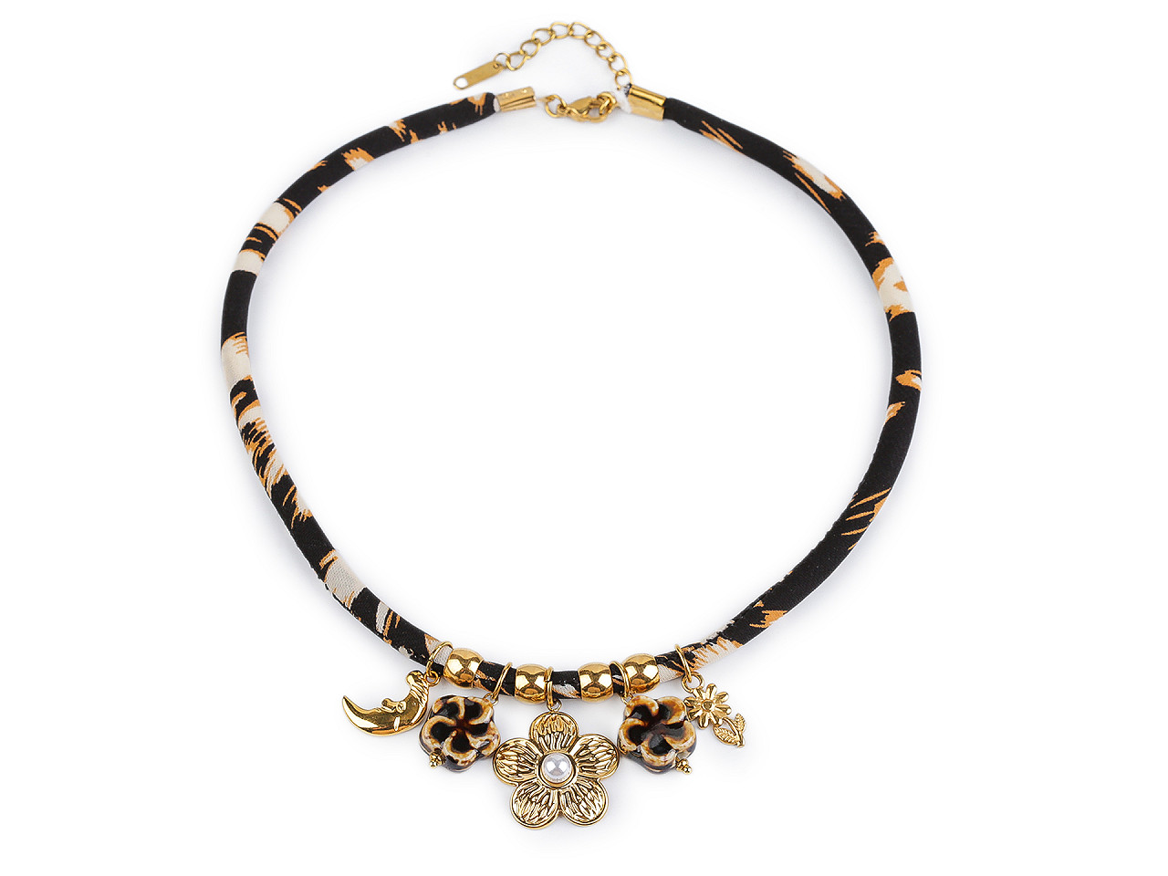 Elegantný náhrdelník ozdobený nerezovou oceľou zaujme svojim pútavým dizajnom a kvalitným spracovaním. Mäkká textilná šnúra je veľmi príjemná na nosenie v kombinácii s nerezovou oceľou sa náhrdelník hodí na každý deň aj na špeciálne príležitosti. Prívesky v tvare kvetov priťahujú pozornosť svojou prepracovanosťou a estetickou hodnotou. Zapína sa na karabínku a predlžovaciu retiazku.