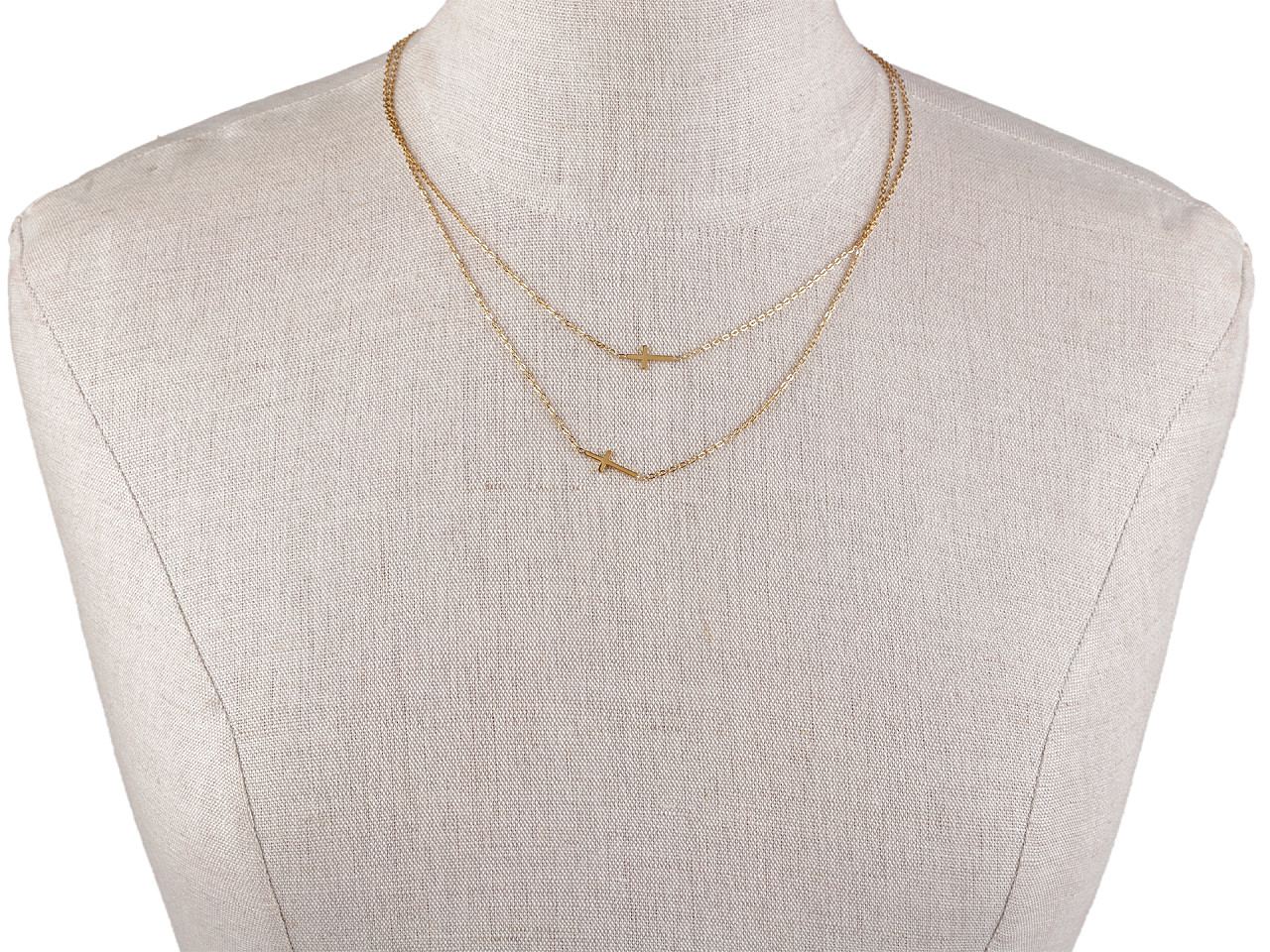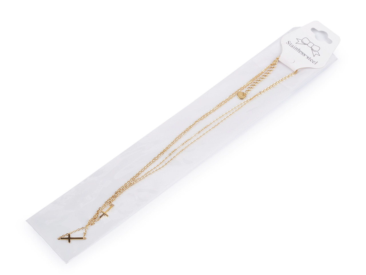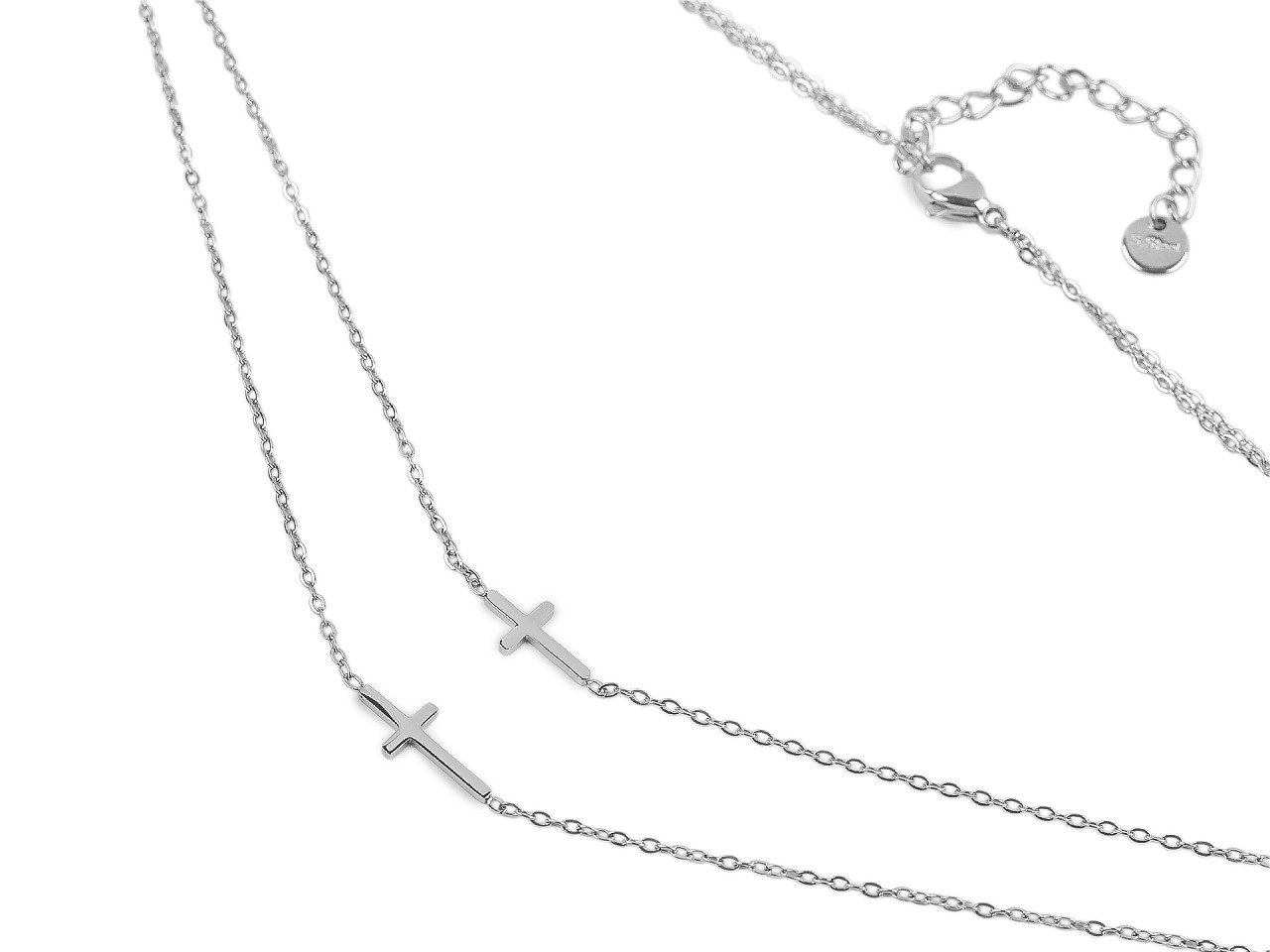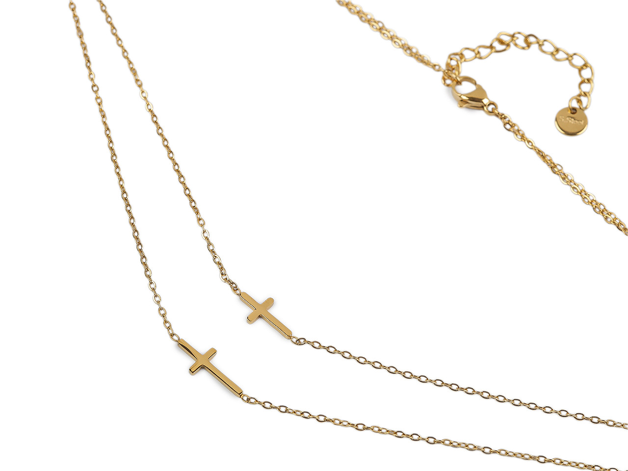 Dvojitý náhrdelník s krížikmi je elegantným doplnkom, ktorý zaujme svojou jemnosťou a rafinovaným dizajnom . Lesklý povrch mu dodáva luxusný vzhľad, zatiaľ čo decentné krížiky prinášajú symboliku a štýl do každodenného outfitu. Zapína sa na karabínku. Vďaka adjustačnej retiazke sa ľahko prispôsobí vášmu krku, aby zakaždým perfektne sedel. Rozmery krížikov sú 6 x 12 mm a 6 x 15 mm.