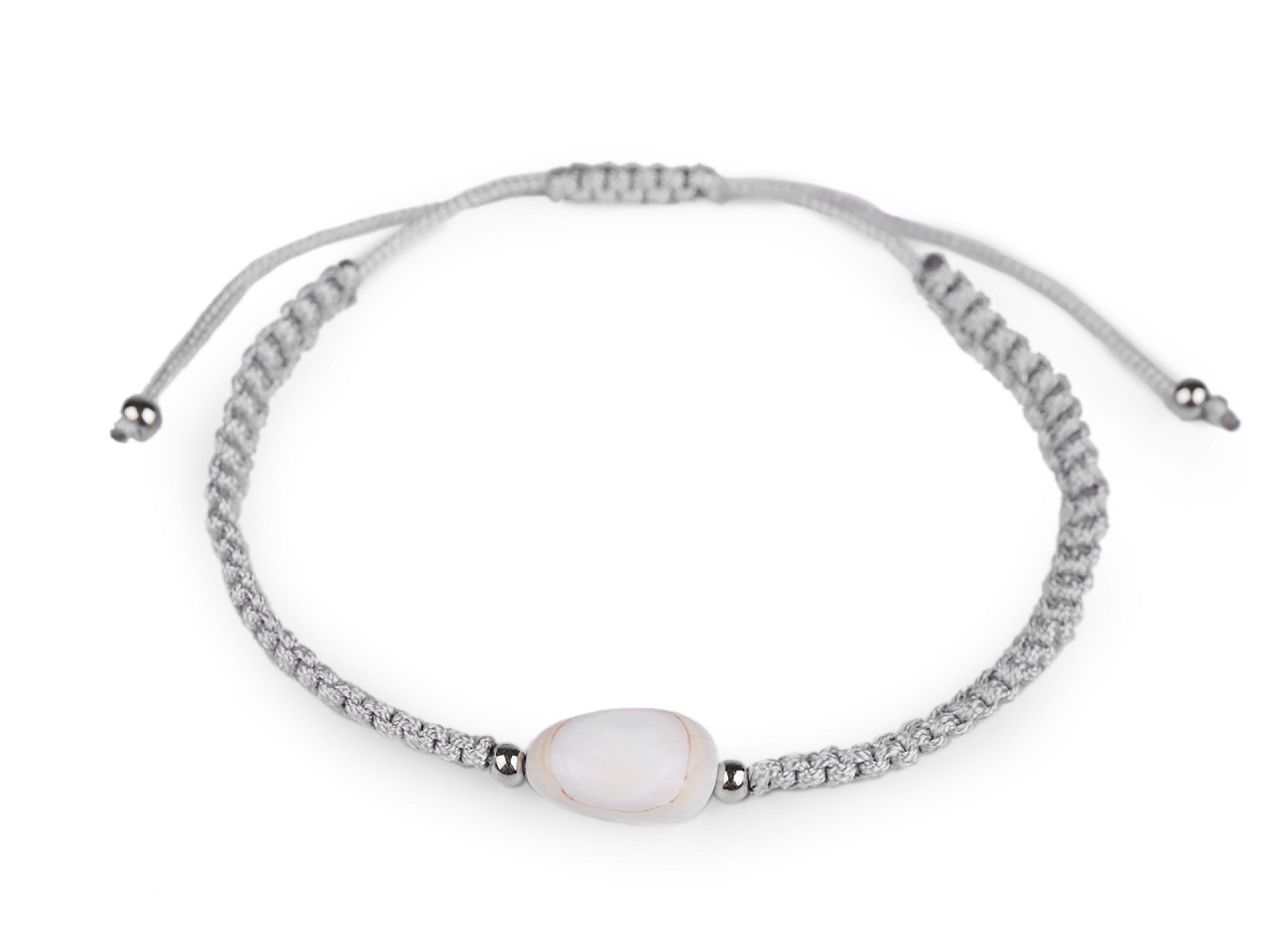 Na macramé šnúrky je v strede pripevnená mušľa a strieborné plastové koráliky. Zapínanie je posuvné, obidva konce náramku prechádzajú stredovým uzlom, ktorý umožňuje utiahnutie šnúrok. Náramok má univerzálnu veľkosť.