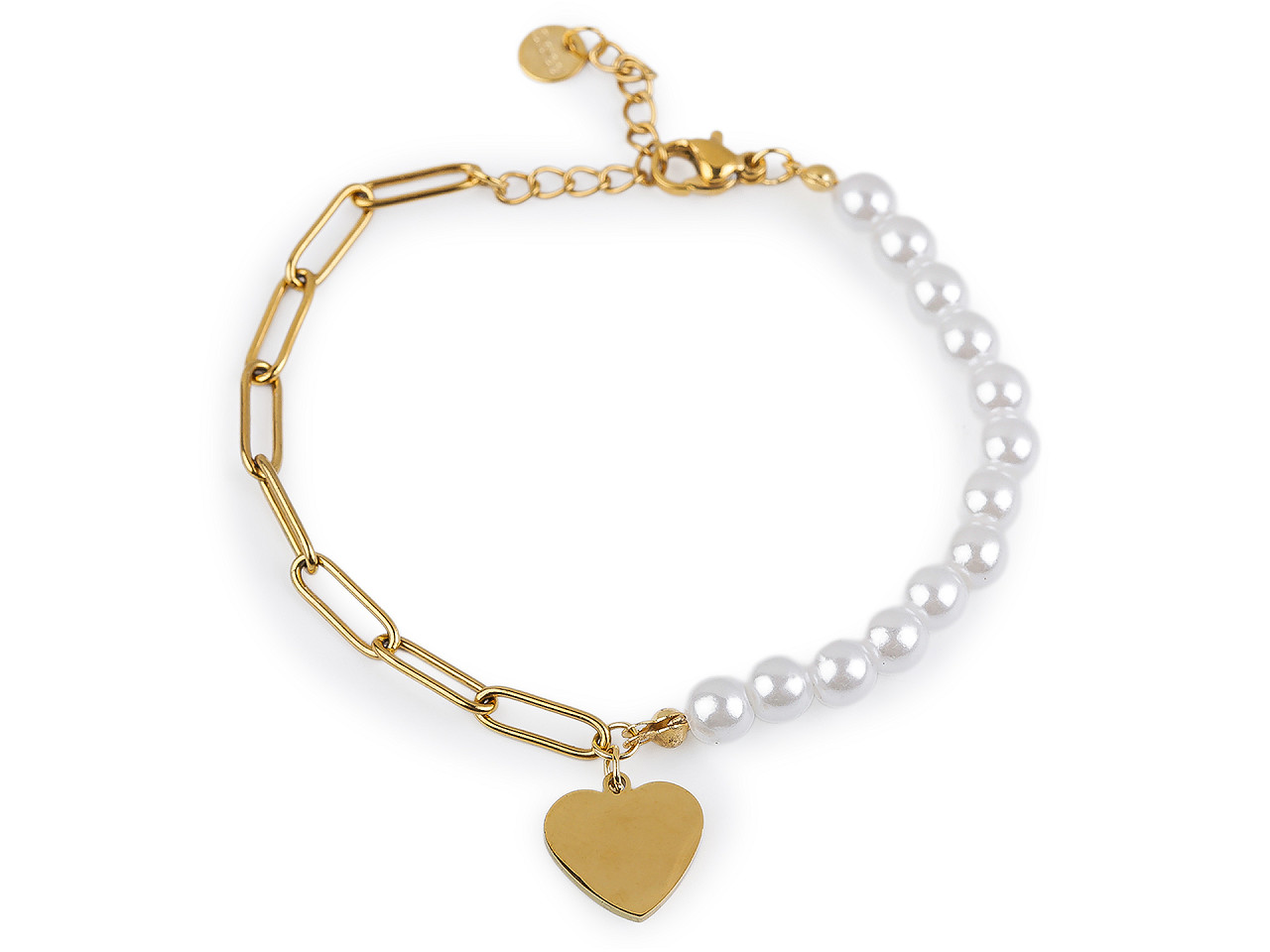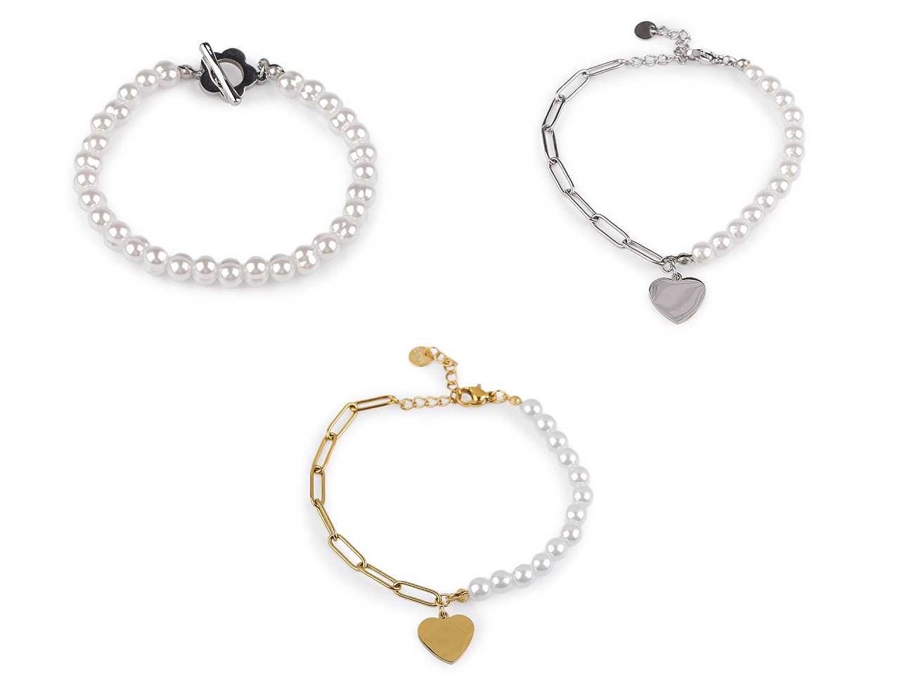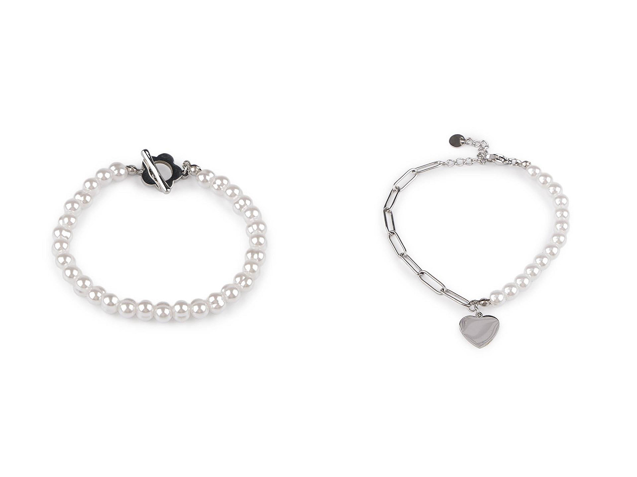 Perlový náramok romanticky dozdobí vaše zápästie, hodí sa na nosenie na každý deň aj na slávnostné príležitosti. Je vyrobený z kvalitnej nerezovej ocele vo vysokom lesku. Náramok č. 1 a 4 má americké zapínanie v tvare kvetu. Náramok č. 3 je ozdobený kovovými srdiečkami, zapína sa na karabínku s predlžovacou retiazkou. Náramok č. 2 a 5 má jednu polovicu z kovovej retiazky. Uprostred je ozdobený príveskom srdca. Zapína sa na karabínku s predlžovacou retiazkou.