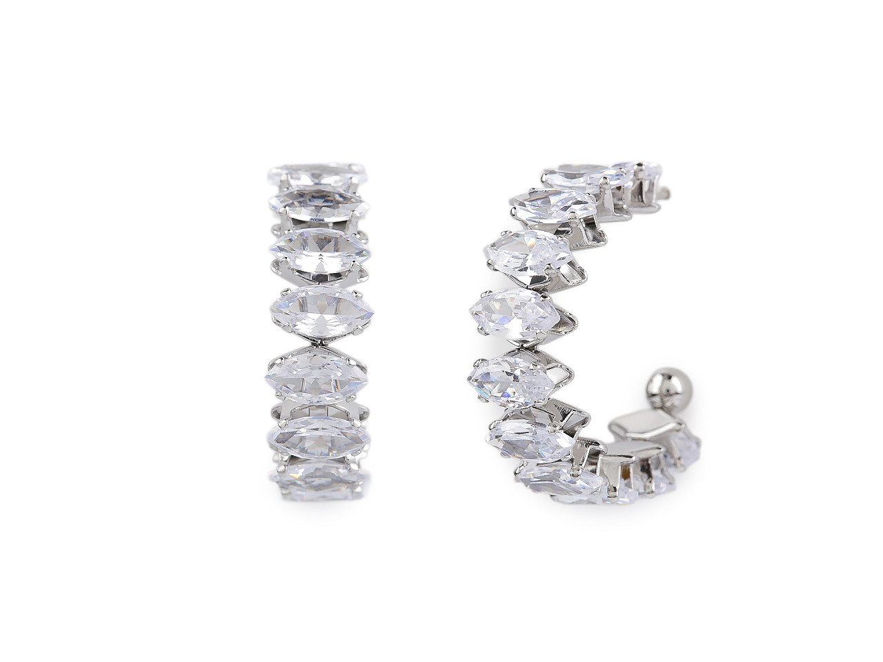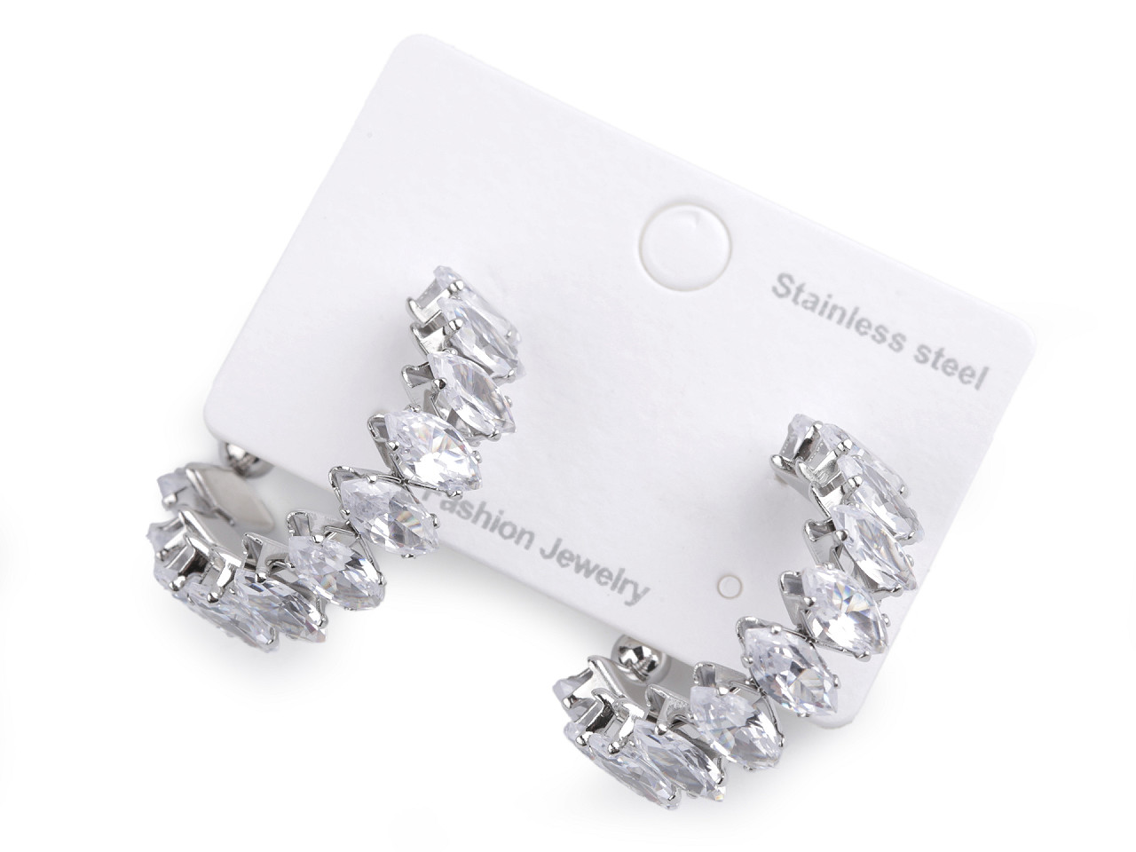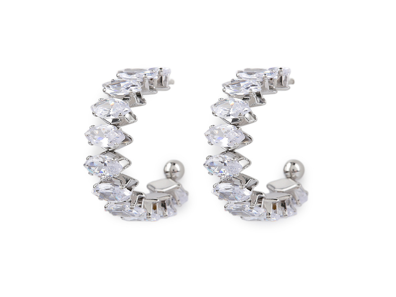 Náušnice z kvalitnej nerezovej ocele sú celé vysadené brúsenými kamienkami v tvare navetiek. Majú oslnivý ligot , sú neprehliadnuteľné. Hodia sa k slávnostným šatám, ale využijete ich aj na bežné nosenie. Majú tvar neuzavretého kruhu. Puzeta je s kovovou zarážkou proti vypadnutiu.