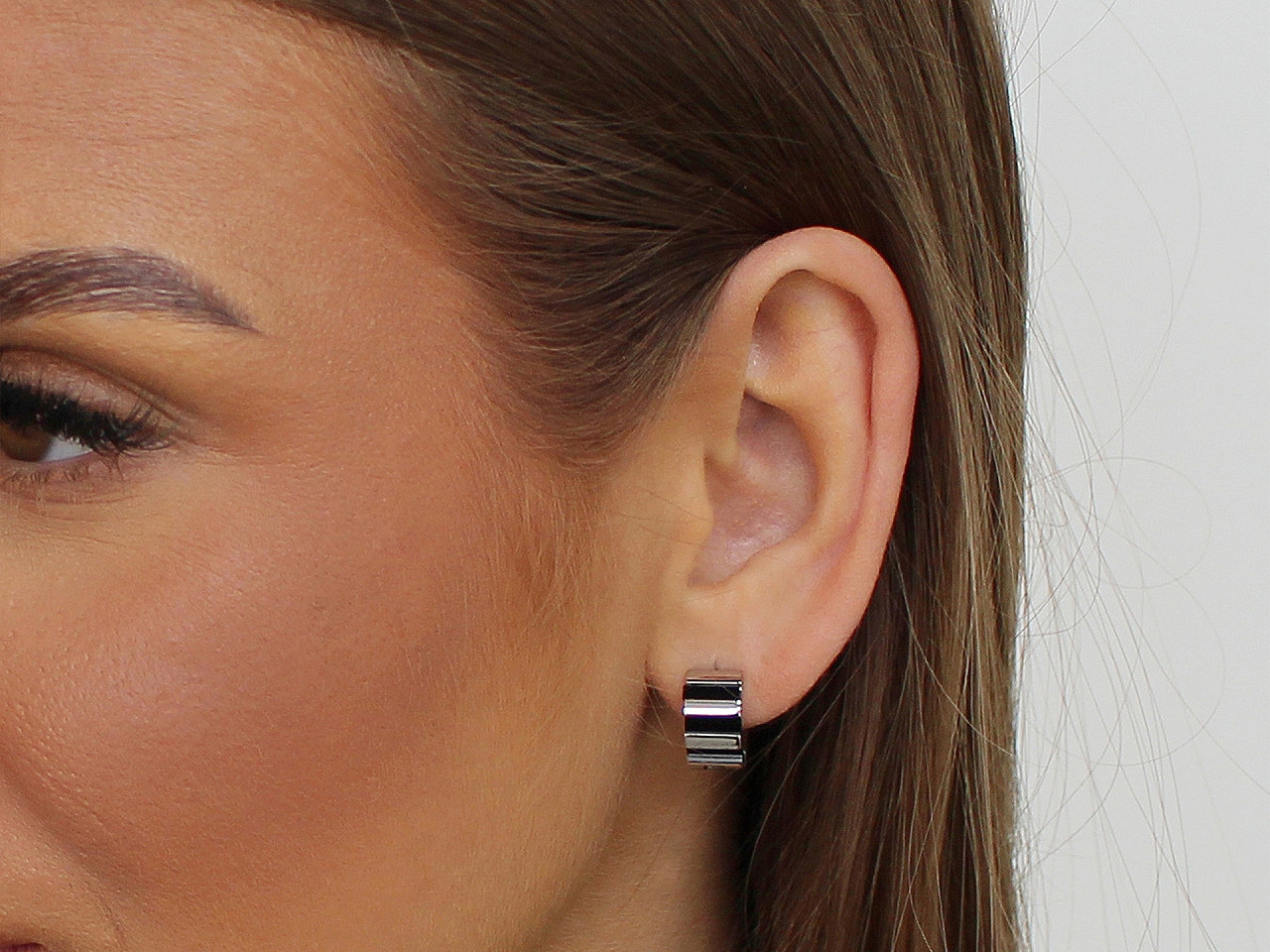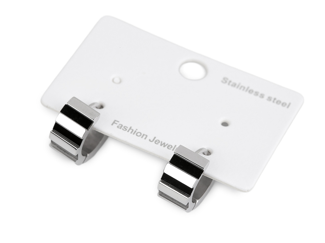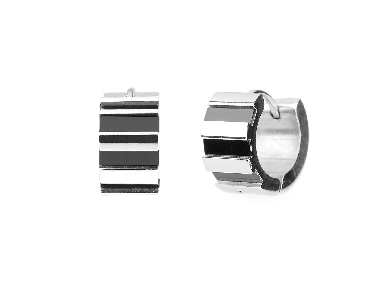 Náušnice krúžky z kvalitnej nerezovej ocele vkusne doplnia akýkoľvek outfit, hodia sa na každodenné nosenie. Na prednej strane ich zdobia 3 vodorovné čierne pruhy. Skvele doplnia biznis štýl obliekania, jeansovú módu aj ležérne outfity. Pôsobia veľmi decentným dojmom, majú zrkadlový lesk. Dajú sa roztvoriť, zapínajú sa zacvaknutím.