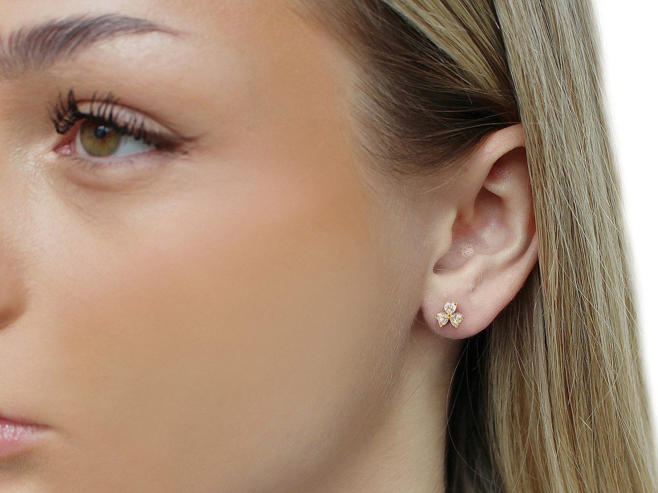 Puzetové náušnice v tvare kvetu trojlístka sú veľmi decentné, vynikajú svojou kvalitou spracovania. Sú ozdobené brúsenými kamienkami . Majú precízne, detailné prevedenie . Jemný kvetinový dizajn sa skvele hodí k širokej škále outfitov, od elegantných večerných šiat až po ležérne denné oblečenie. Sú tiež skvelým darčekom pre blízkych, ktorí ocenia krásu a trvanlivosť tohto nadčasového šperku. Puzeta je s kovovou zarážkou proti vypadnutiu.