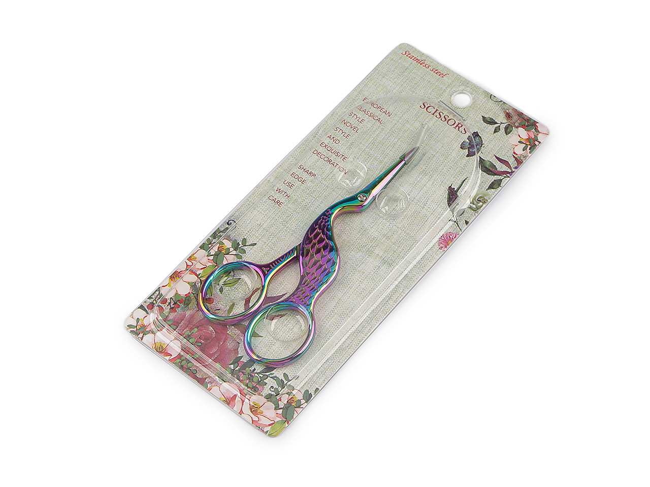 Elegantné nožnice v tvare bociana majú pevné a ostré brity, navyše vás zaujme ich zafarbenie s efektnými dúhovými prechodmi . Využijete ich pri vyšívaní aj strihaní či vystrihovaní papiera a pod. Vďaka malej veľkosti sú nožnice vhodné i na starostlivé strihanie drobných vecí, ktoré využijete napríklad pri scrapbookingu.