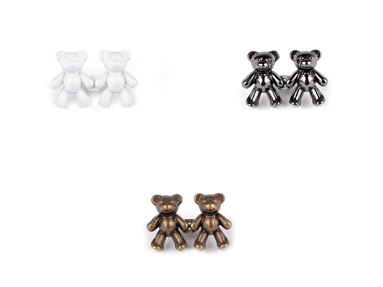 Ozdobné kovové zapínanie s medvedíkmi sa skladá z dvoch častí, ktoré do seba zaháknete. Dá sa opakovane používať bez nutnosti prišitia, pretože má praktické jednobodové pripnutie ako odznak . Poslúži tak aj ako dizajnový skracovač v páse nohavíc alebo sukní. Celková dĺžka po zapnutí je 40 mm.