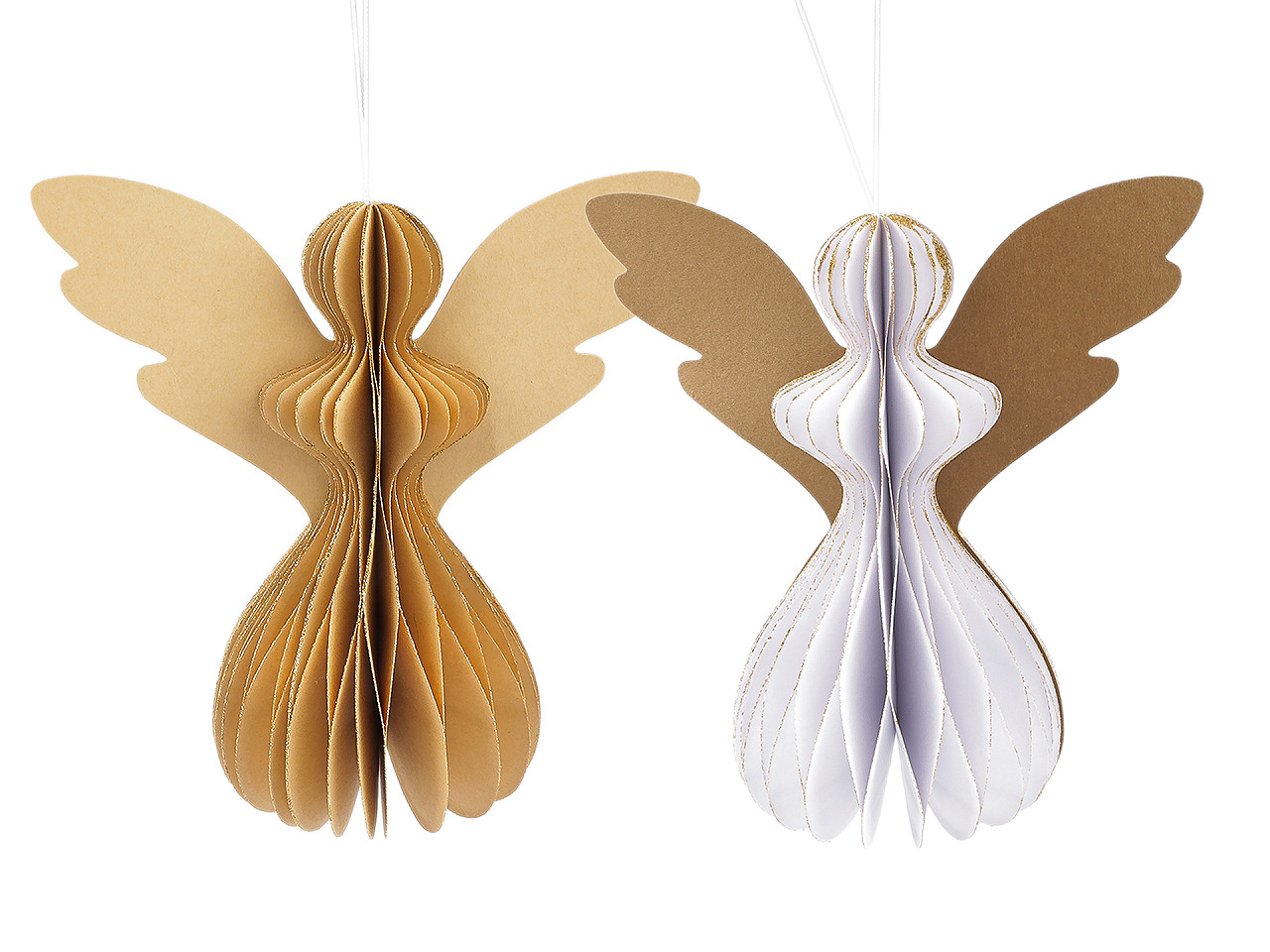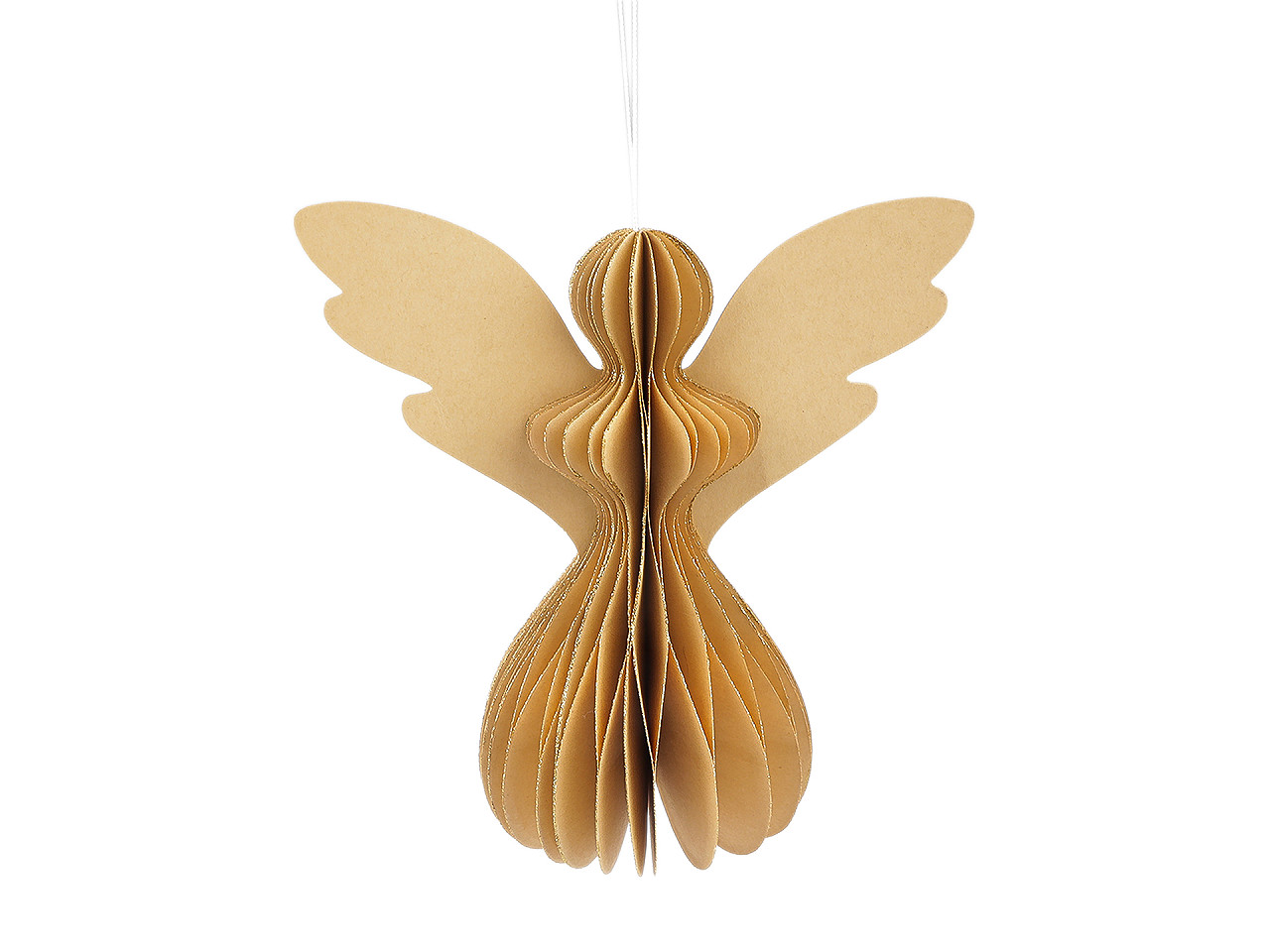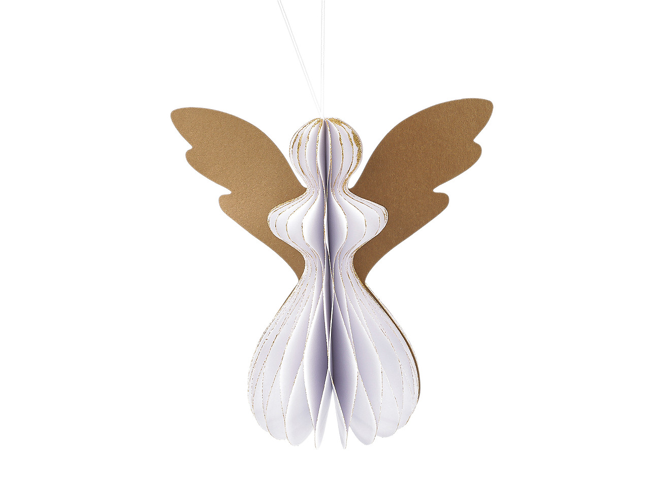Závesný anjel je vyrobený z plástvového papiera , ktorý pri roztiahnutí vytvára efekt pripomínajúci včelí plást. Anjel má pútko na zavesenie , ale vďaka širokej základni aj výborne stojí . Tvar anjela skvele drží vďaka magnetom , ktoré sú vo vnútri. Hrany papiera zdobia trblietavé glitre .
