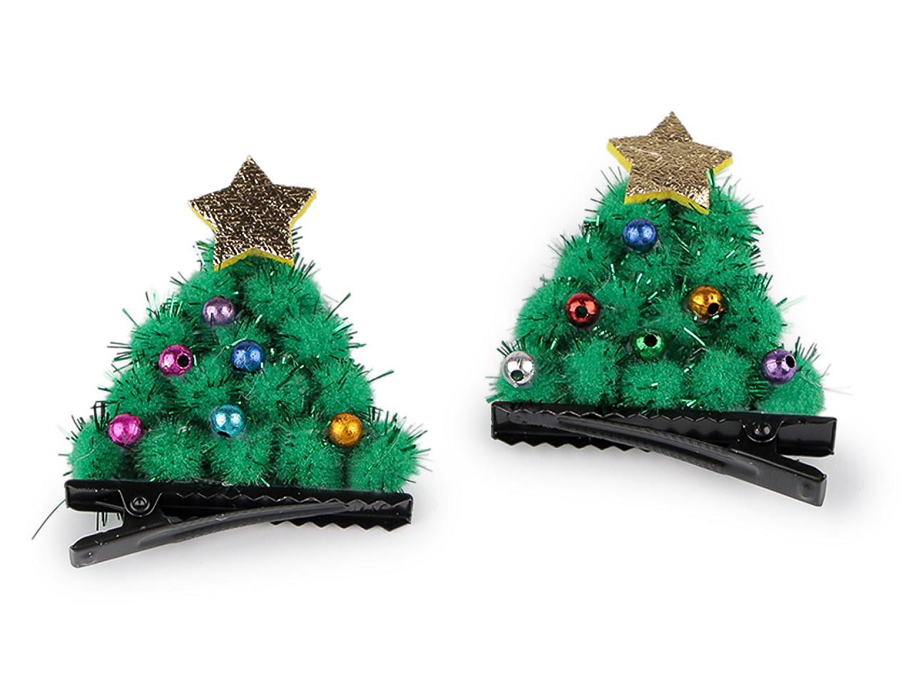 Sponky s vianočným stromčekom potešia malé aj veľké slečny. Malé ich ocenia na dozdobenie roztomilého detského účesu, pre veľké slečny sa stanú nepostrádateľným doplnkom vianočných večierkov. Sú ozdobené metalickými korálkami a zlatou hviezdou , sú zostavené z chlpatých brmbolcov s lurexom. Spony majú zúbky, v účese perfektne držia. Nemusia sa nosiť len vo vlasoch, môžete si ich ozdobne pripnúť na tašku, ako zimnú dekoráciu a pod.