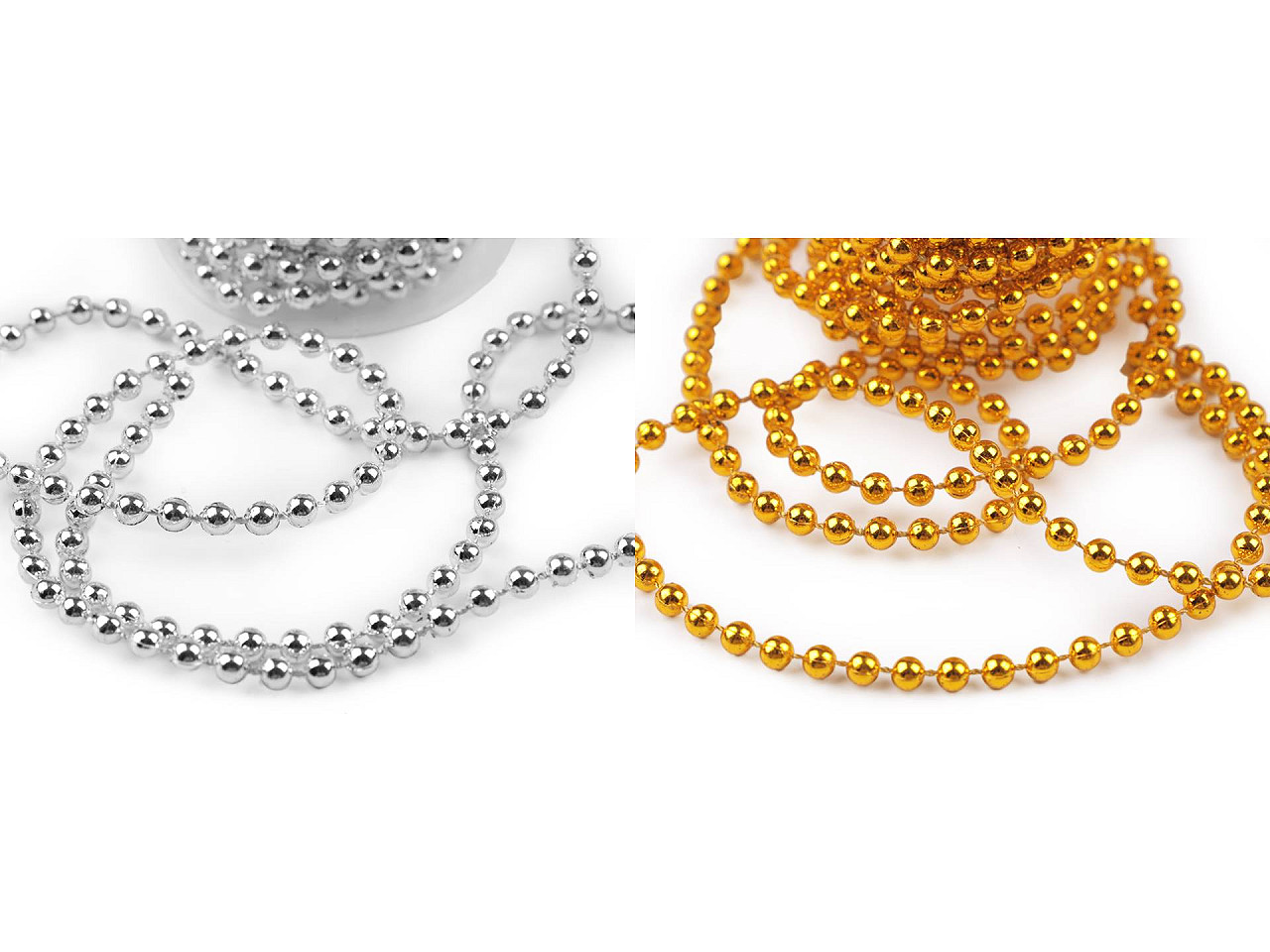 Šnúru plastových perál využijete na vianočné i svadobné aranžmány. Je vhodná na ozdobenie kvetinových väzieb, vencov, stoličiek alebo ako reťaz na stromček. Guličky sa dajú ľahko oddeliť nožnicami, reťaz si môžete sami skrátiť.