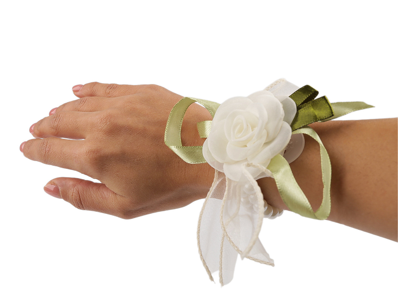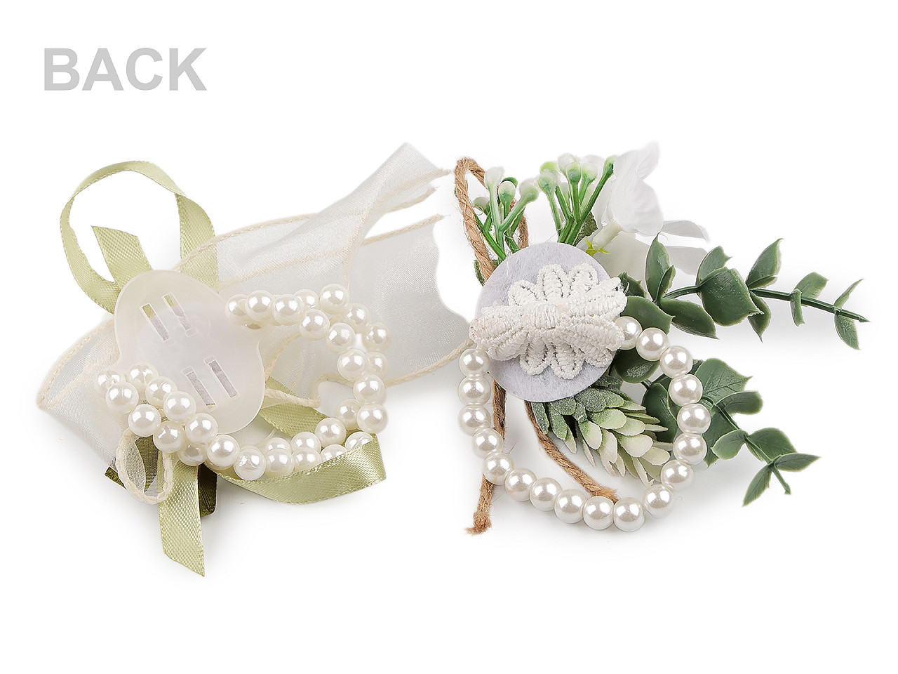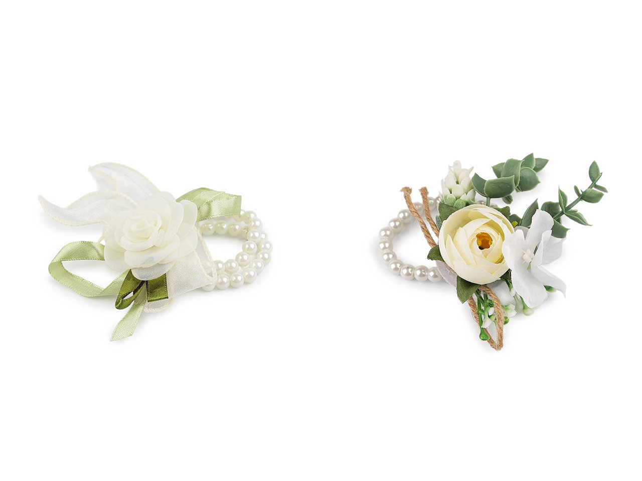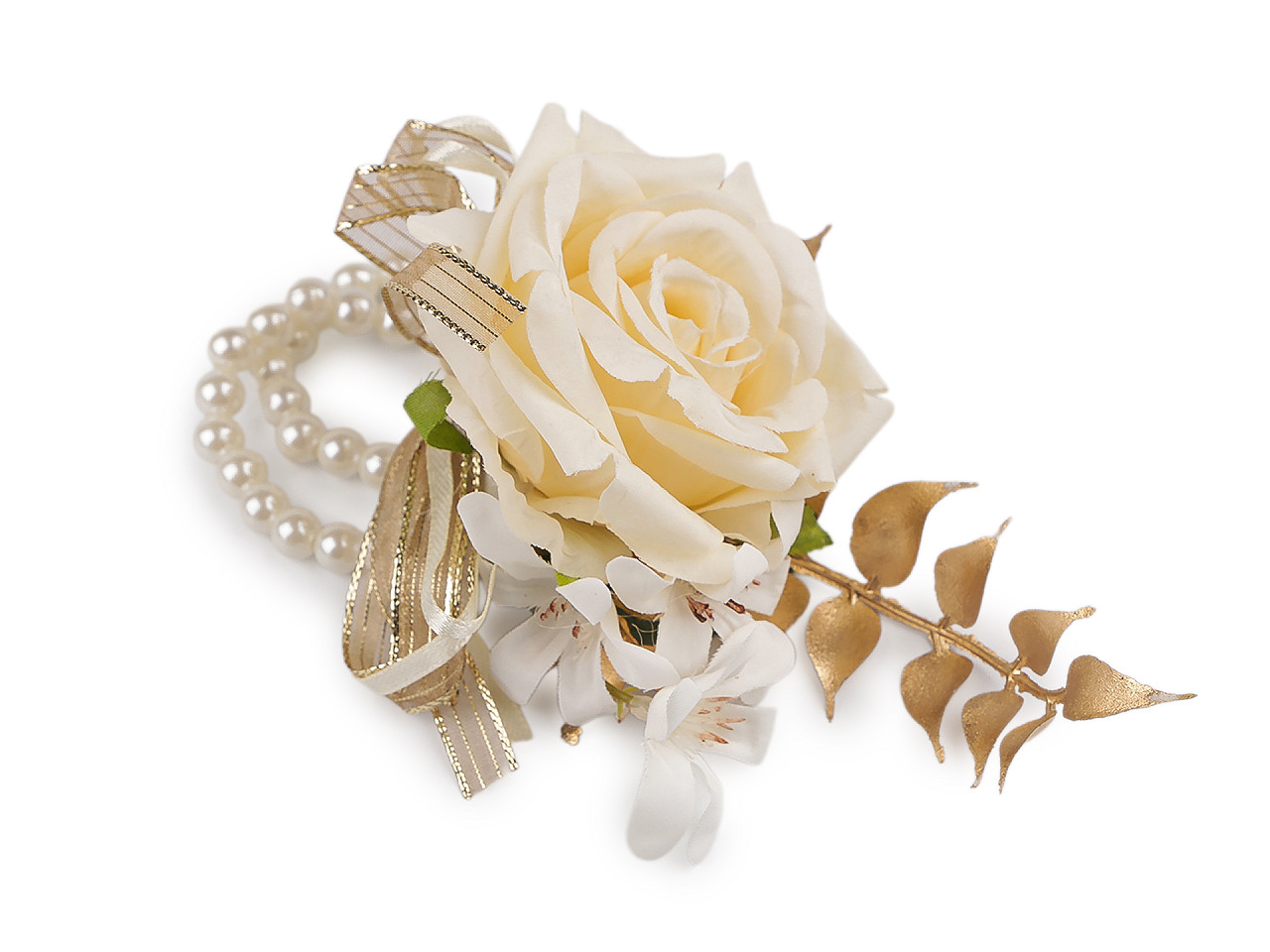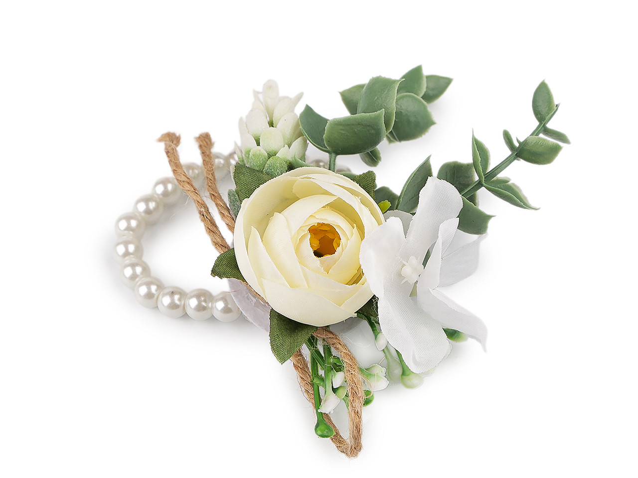 Perlový náramok s ružičkami je určený predovšetkým pre svedkyňu, družičky, mamičku alebo len tak. Poteší všetky ženy, ktoré sa rady zdobia romantickými doplnkami. Je pružný, má univerzálnu veľkosť . V strede sú 3 ružičky doplnené malou hortenziou, bobuľami, vetvičkami a listom. Priemer ružičiek je 3,5 cm, priemer celého kvetinového stredu je 7,5 cm. Perly majú priemer 0,8 cm.
