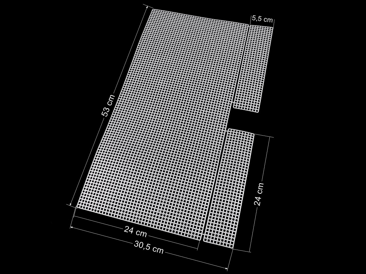 Plastová kanava je polotovar, z ktorého si môžete vyrobiť kabelku s rozmermi cca 25 x 24 x 5,5 cm. Na výrobu je vhodná silnejšia priadza, ktorá je určená na pletenie či háčkovanie. Použiť môžete aj šnúru či odolnejšiu stuhu (napr. rypsovú). Kanavu po celom povrchu vyšijete priadzou a zošijete po stranách. Otvor jedného štvorčeka má rozmery 4,5 x 4,5 mm.
