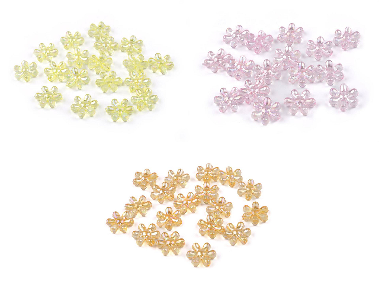 Plastové koráliky v tvare kvetu nadchnú deti aj dospelých. Sú doslova magické, pretože sú transparentné, ale ich povrch má vysoký lesk s AB efektom . Našim fotografom sa fotografie veľmi podarili, ale verte, že v skutočnosti sú koráliky ešte zaujímavejšie. Koráliky môžete použiť na výrobu náhrdelníkov, náramkov, príveskov ku kľúčom a pod. Prievlak je umiestnený cez celý korálik - od špičky lístka stredom do špičky protiľahlého lístka - po navlečení sa kvety radia naplocho vedľa seba. Balenie 10 g obsahuje cca 18 ks korálikov.