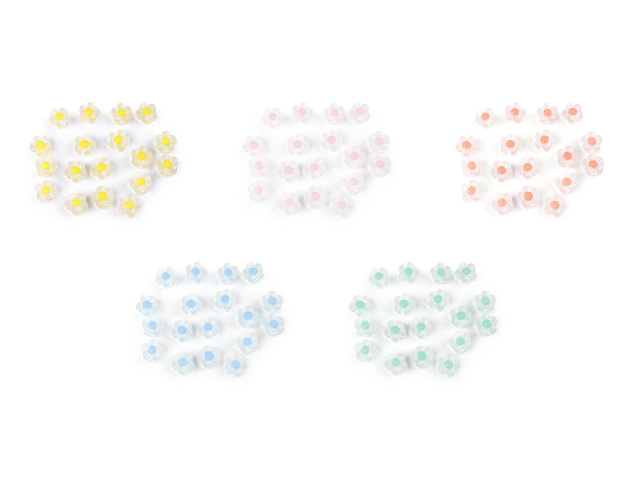 Plastové korálky v tvare kvetu si obľúbia dospelí aj deti. Stred majú farebný, okvetné lístky sú z matného transparentného plastu . Využijete ich na výrobu bižutérie , náušníc , príveskov ku kľúčom a pod. Môžete ich navliekať napríklad na gumičku či silón . Deti si môžu sami navliecť jednoduchý náramok z gumy, kvety sa budú krásne radiť vedľa seba. V balení 10 g je cca 18 ks koráliek.