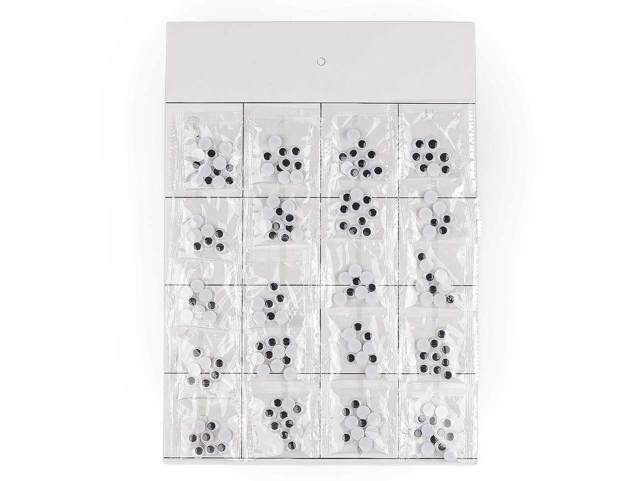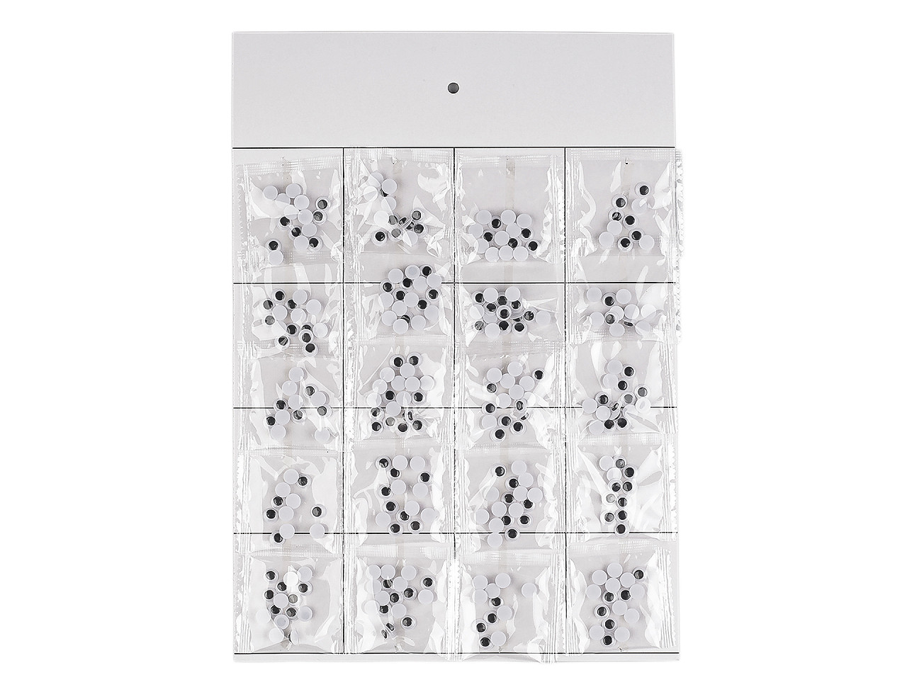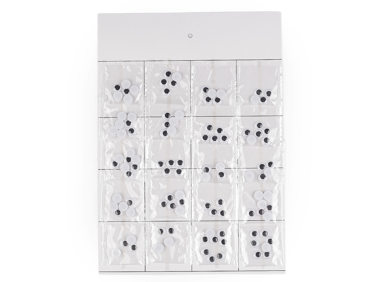 Plastové oči s pohyblivou šošovkou dodajú tvári ľudí alebo zvierat veselý pohľad. Sú pomyselnou bodkou vášho dekoratívneho snaženia. Čierna šošovka je pohyblivá. Spodná strana je opatrená samolepiacou fóliou , vďaka nej je nalepenie očí veľmi jednoduché. Odlepte spodný krycí papier a oči prilepte na suchý, čistý, pevný povrch. Široké uplatnenie nájdu pri tvorbe originálnych prianí technikou scrapbooking . Predávame na papierovej karte s otvorom na zavesenie na predajný stojan. Na karte je nalepených 20 transparentných sáčkov. Vrecká s Ø6 mm obsahujú cca 23 ks očí. Vrecká s Ø8 mm obsahujú cca 20 ks očí. Vrecká s Ø10 mm obsahujú cca 10 ks očí. Vrecká s Ø12 mm obsahujú cca 6 ks očí.