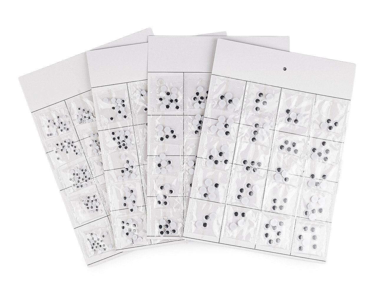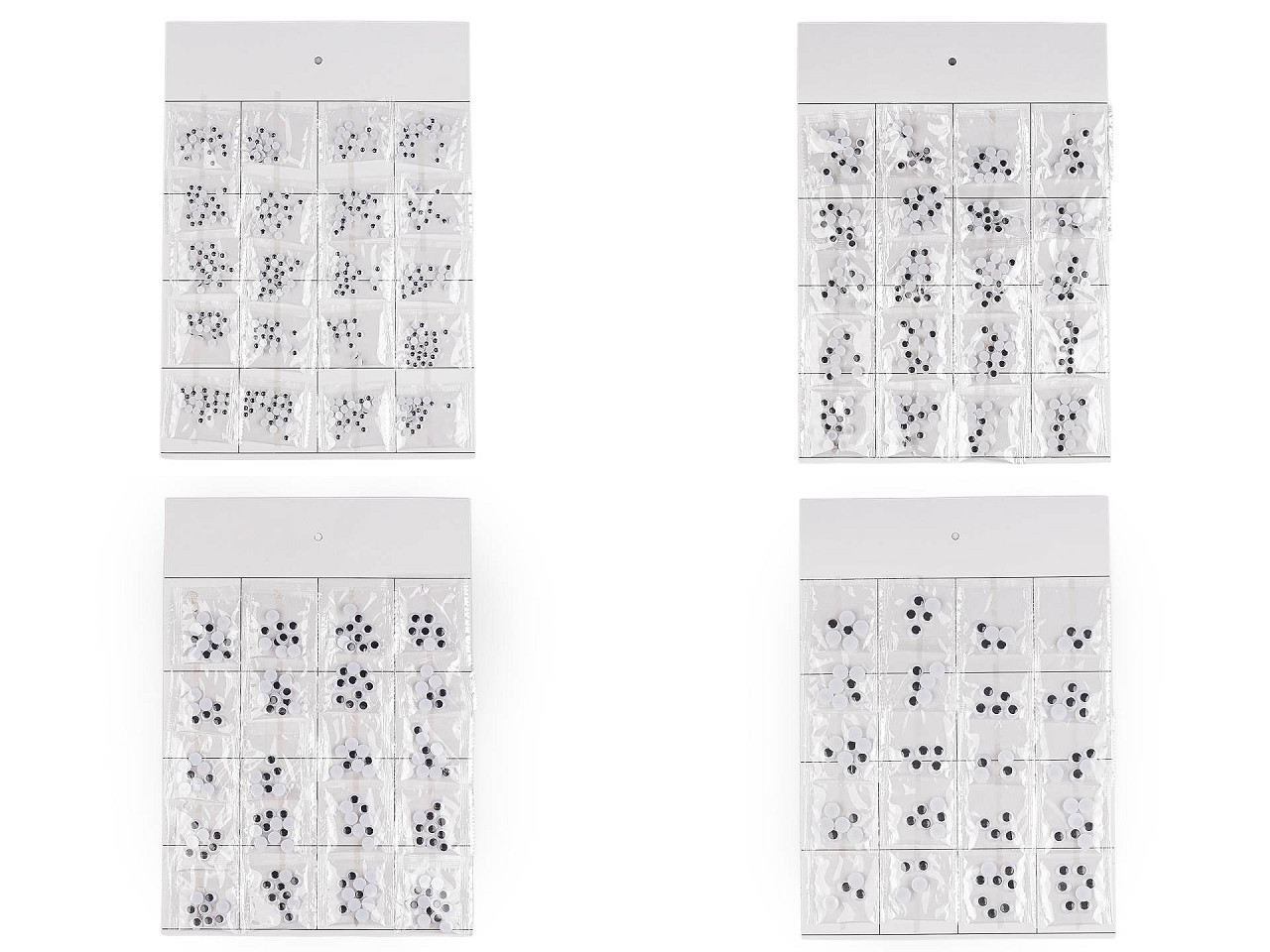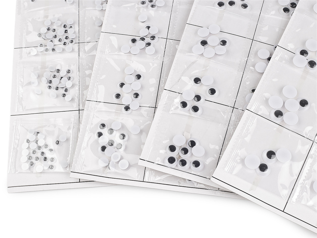 Plastové oči s pohyblivou šošovkou dodajú tvári ľudí alebo zvierat veselý pohľad. Sú pomyselnou bodkou vášho dekoratívneho snaženia. Čierna šošovka je pohyblivá. Spodná strana je opatrená samolepiacou fóliou , vďaka nej je nalepenie očí veľmi jednoduché. Odlepte spodný krycí papier a oči prilepte na suchý, čistý, pevný povrch. Široké uplatnenie nájdu pri tvorbe originálnych prianí technikou scrapbooking . Predávame na papierovej karte s otvorom na zavesenie na predajný stojan. Na karte je nalepených 20 transparentných sáčkov. Vrecká s Ø6 mm obsahujú cca 23 ks očí. Vrecká s Ø8 mm obsahujú cca 20 ks očí. Vrecká s Ø10 mm obsahujú cca 10 ks očí. Vrecká s Ø12 mm obsahujú cca 6 ks očí.